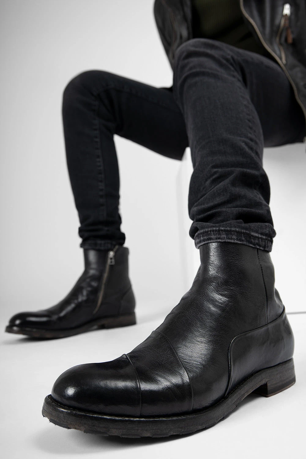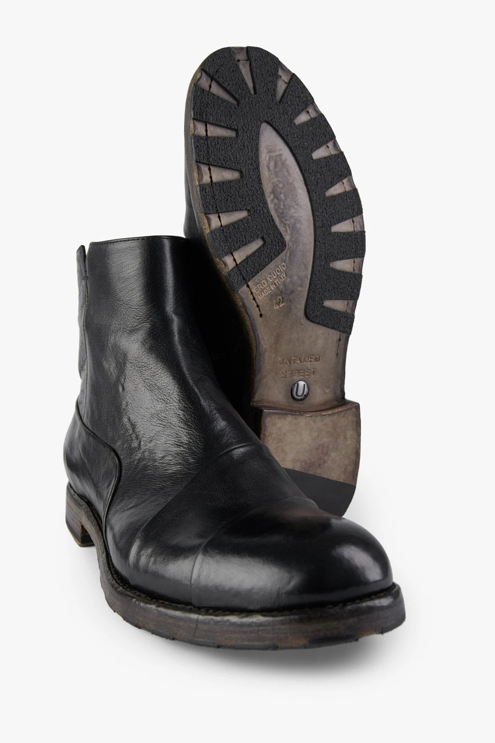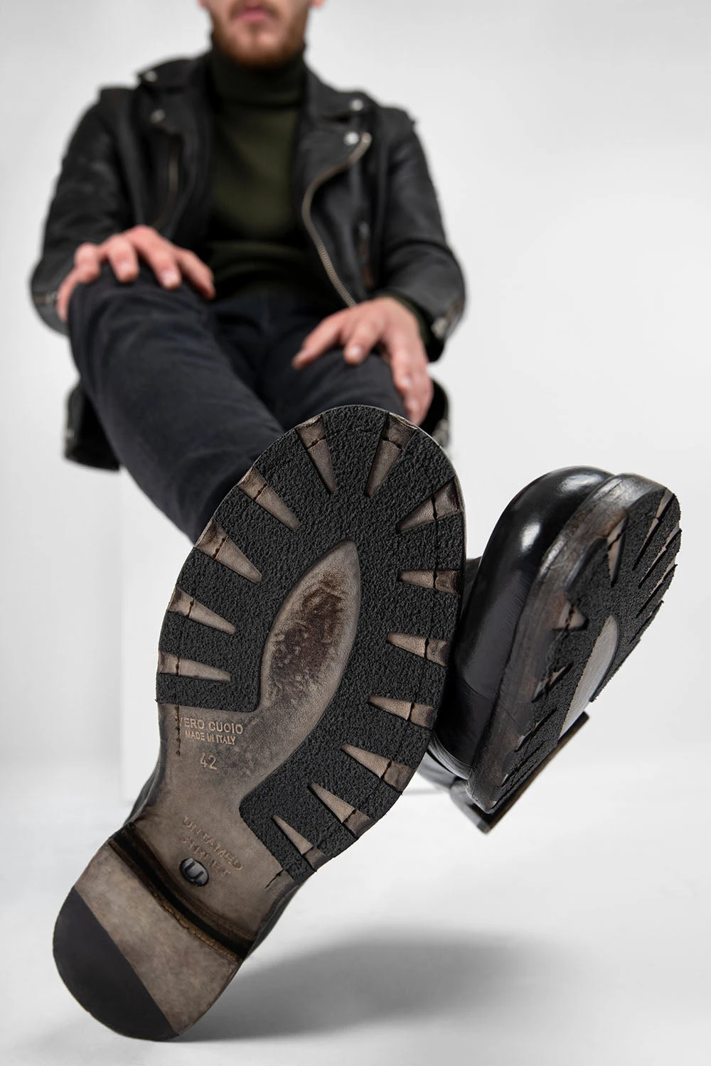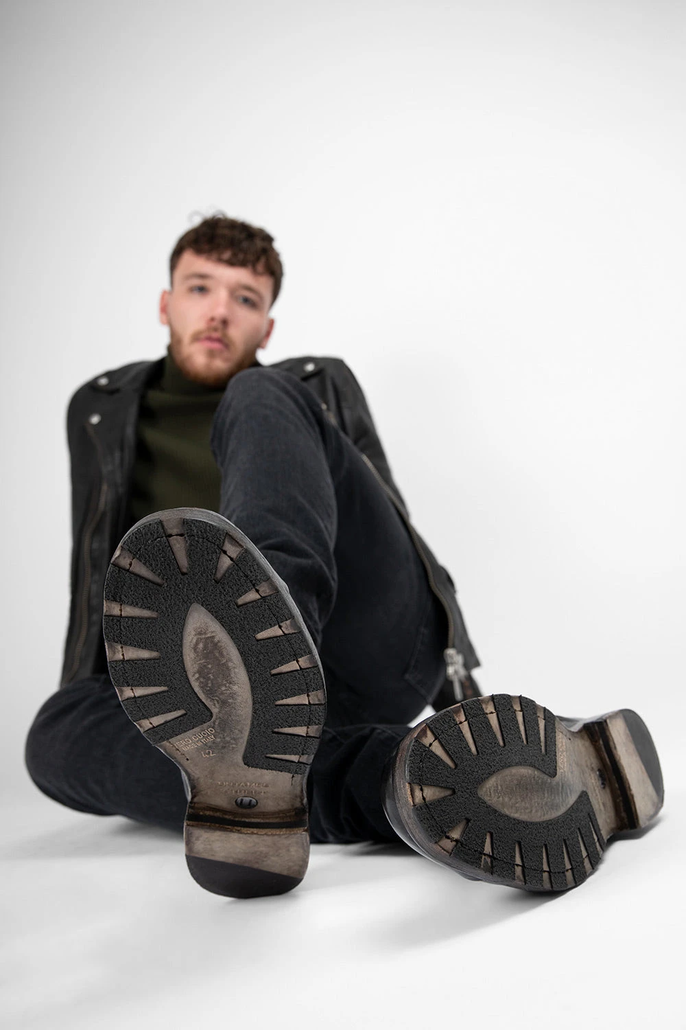 A luxurious ankle boot, entirely handmade in Italy, featuring the best vegetable-tanned buffalo leather, hand-dyed in a beautiful deep black. Stonewashed and hand-polished, this style is a celebration of mastery and craftsmanship, with its remarkable angled folded stitching. A beautiful rubber-injected leather sole completes this style that showcases elegance, character and individuality and is sure to attract lots of attention.