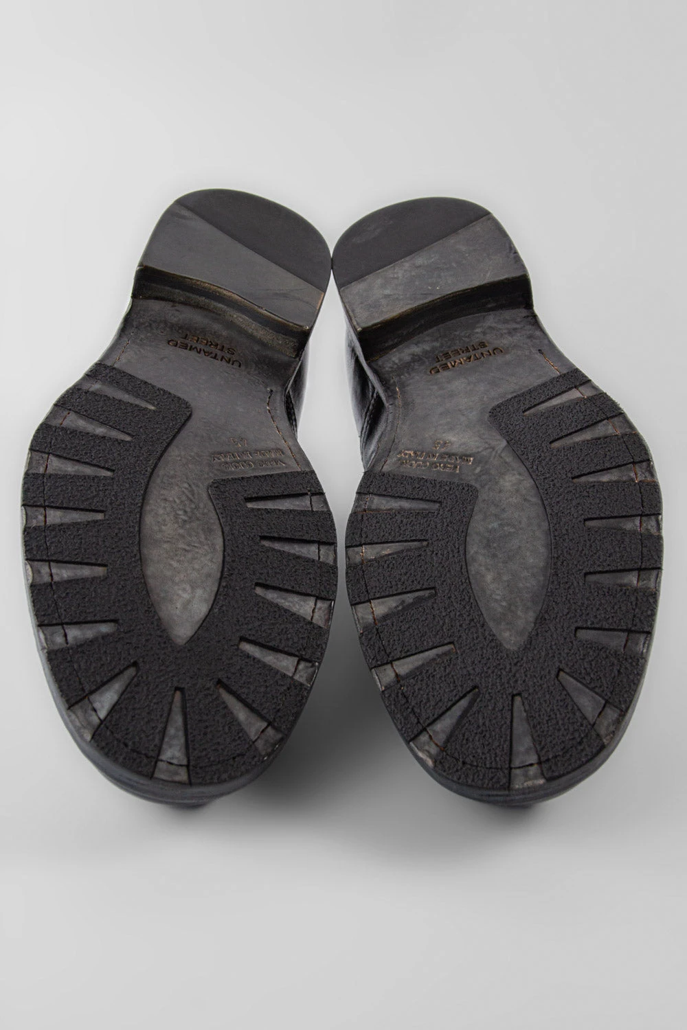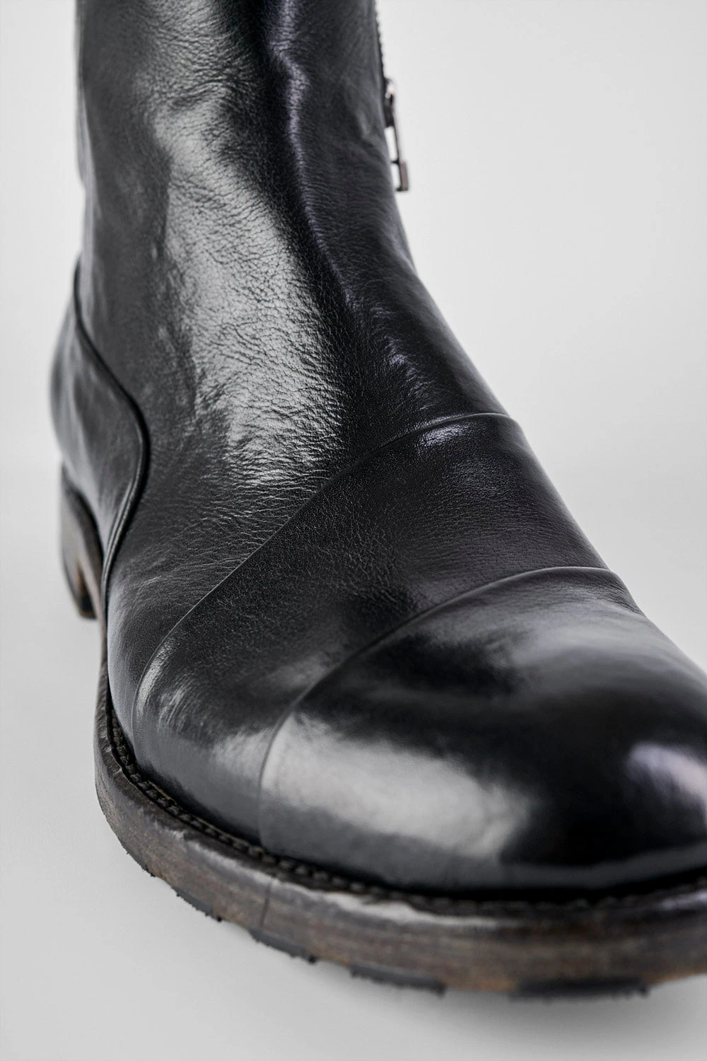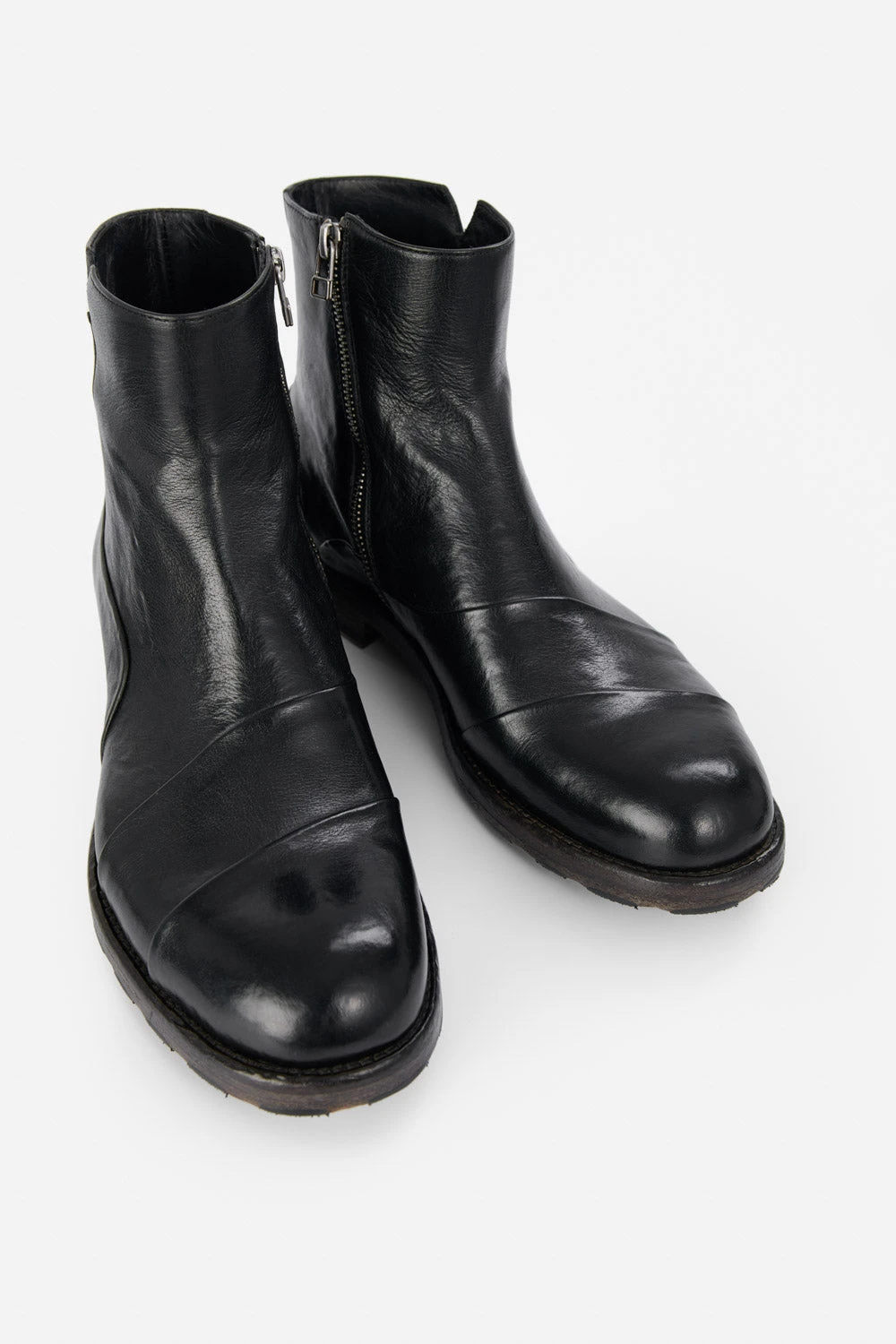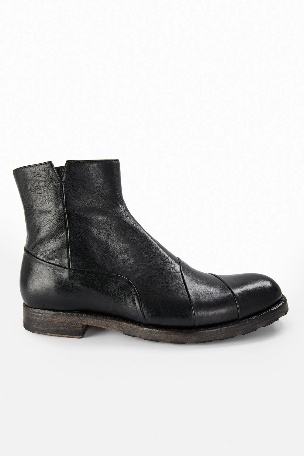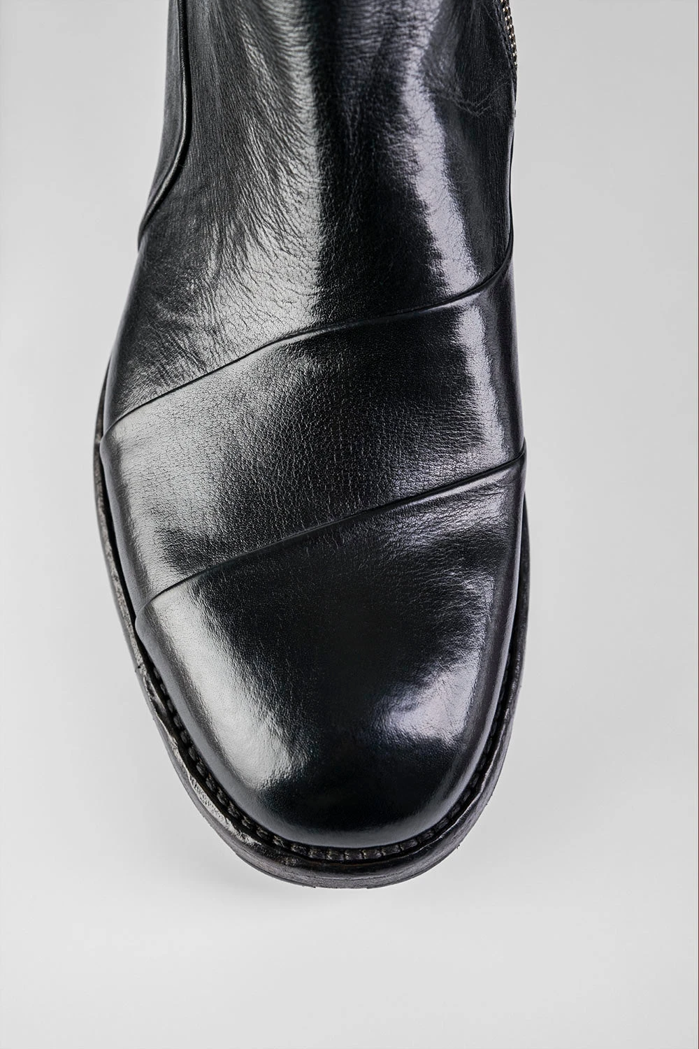 A luxurious ankle boot, entirely handmade in Italy, featuring the best vegetable-tanned buffalo leather, hand-dyed in a beautiful deep black. Stonewashed and hand-polished, this style is a celebration of mastery and craftsmanship, with its remarkable angled folded stitching. A beautiful rubber-injected leather sole completes this style that showcases elegance, character and individuality and is sure to attract lots of attention.