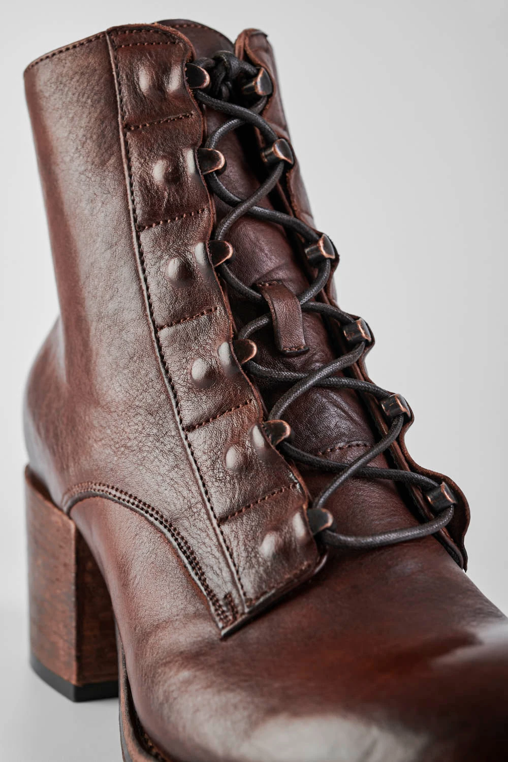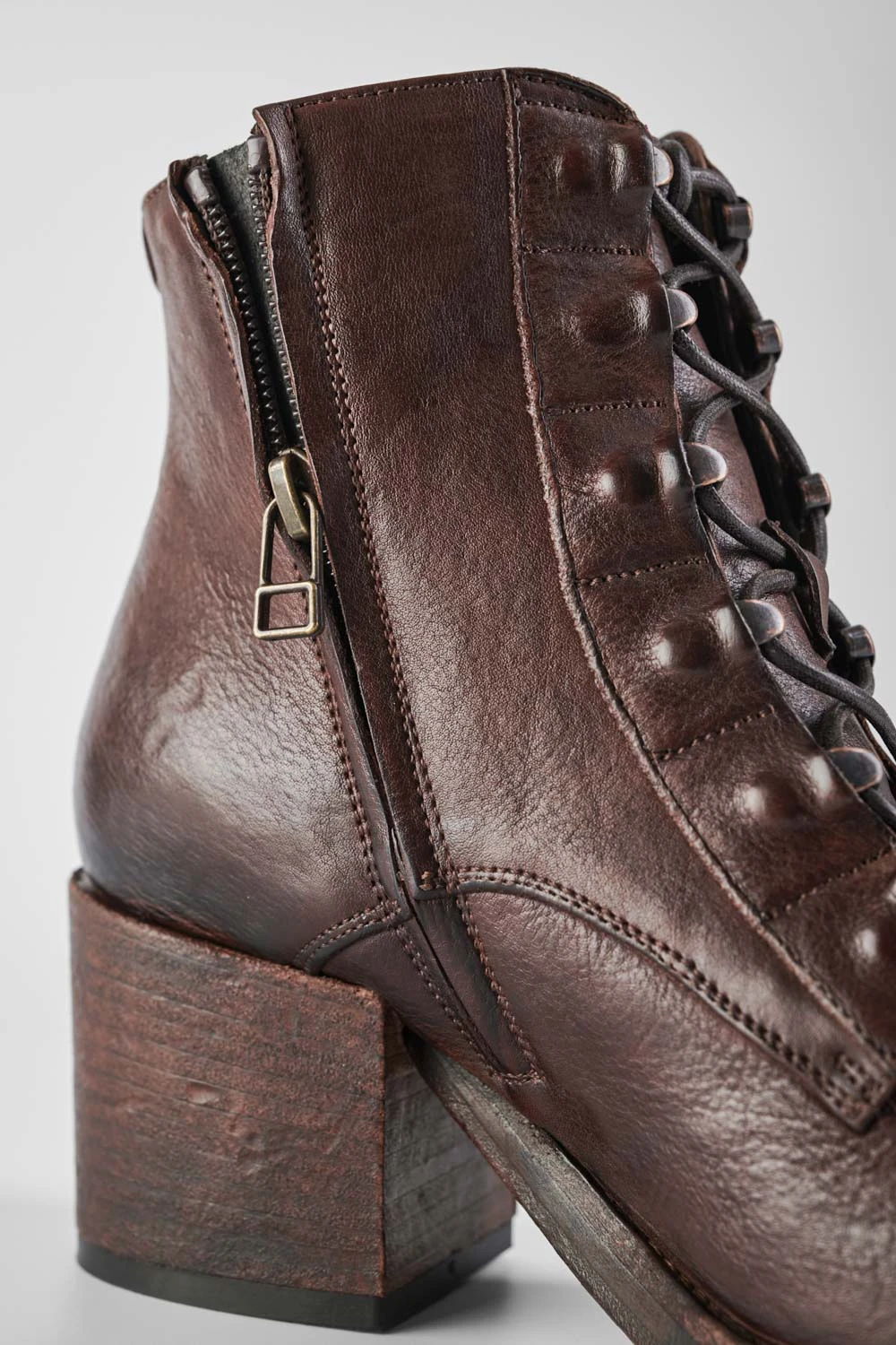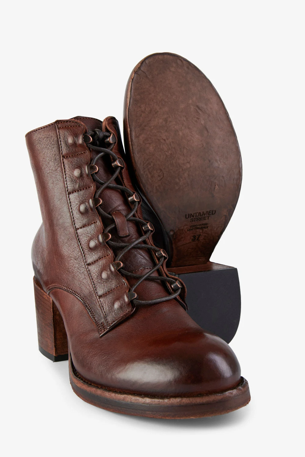 We have taken a classic lace-up bootie and given it an updated urban twist and loads of energy and appeal. Fantastic vegetable-tanned full-grain leather, finely burnished to lend the style an incredible depth and polish. Very comfortable with its round toe and low block heel, this style features tonal laces running down the front, with bold semi-exposed brass eyelets, for a daring attitude. An essential, to build your longevity wardrobe of essentials.