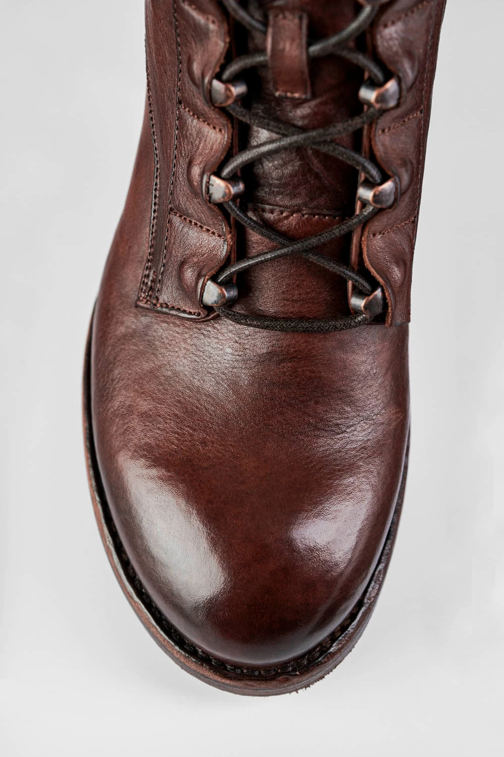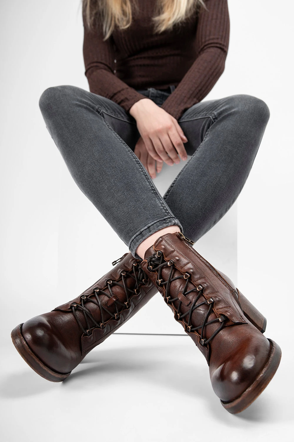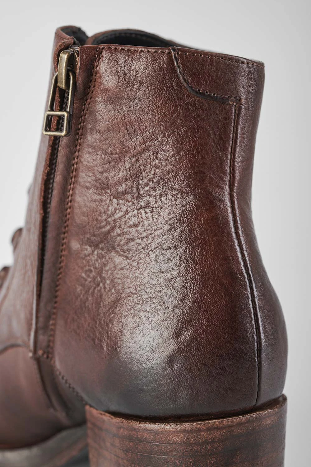 We have taken a classic lace-up bootie and given it an updated urban twist and loads of energy and appeal. Fantastic vegetable-tanned full-grain leather, finely burnished to lend the style an incredible depth and polish. Very comfortable with its round toe and low block heel, this style features tonal laces running down the front, with bold semi-exposed brass eyelets, for a daring attitude. An essential, to build your longevity wardrobe of essentials.