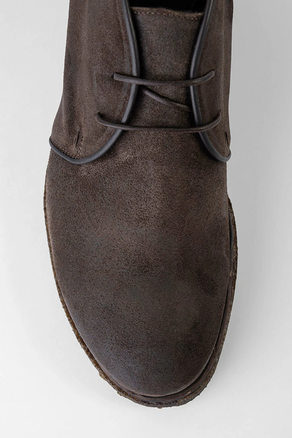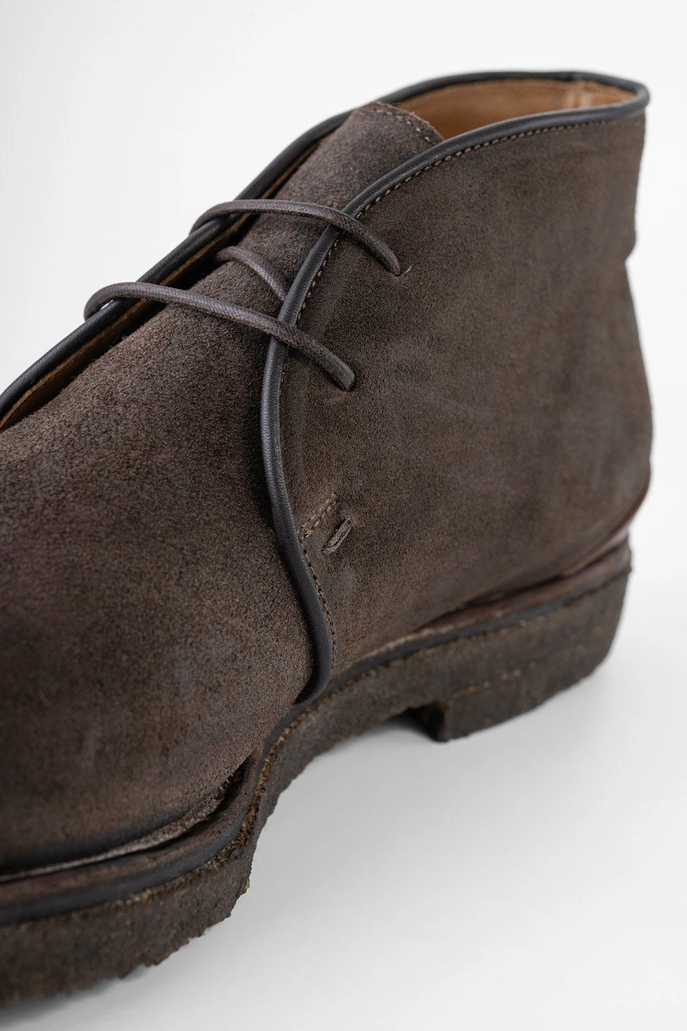 One of our most popular styles, this ankle boot exudes energy and character. Featuring a sturdy natural crepe sole, this style is not made of common oiled suede you can find at other brands, but suede which is waxed in a barrel to make it more water resistant and durable. A beautiful natural material in a beautiful shade of dark brown, for a shoe where comfort and adaptability meet a style that draws the eye with its bold personality and rebellious edge.