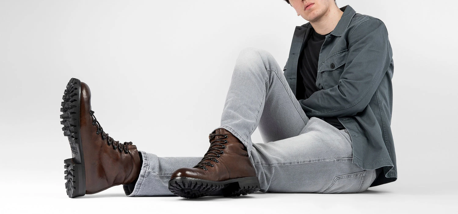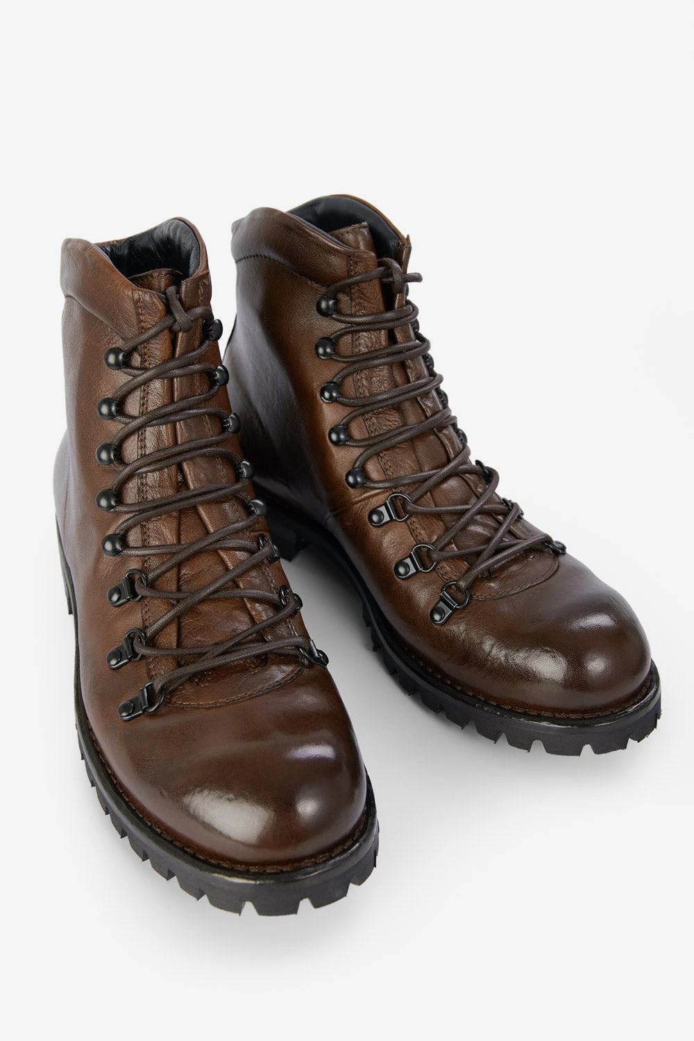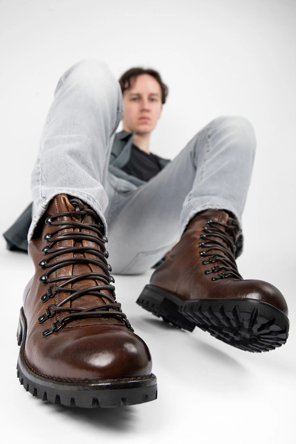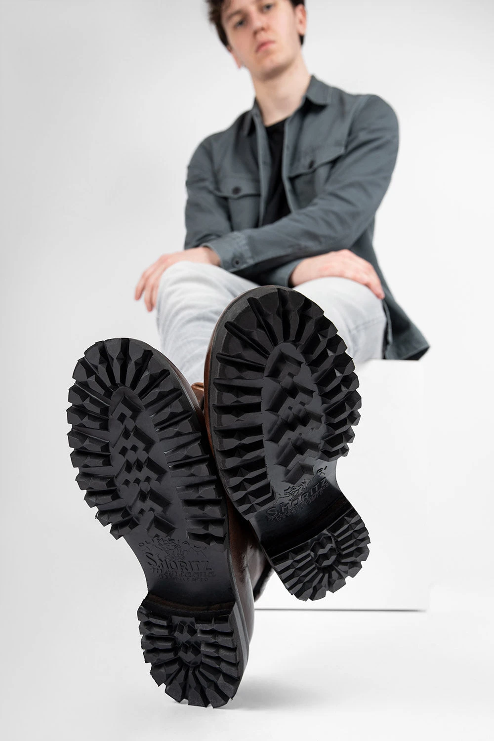 The Untamed Street urban take on mountain boots: bold, rugged, eye-catching; a staple of our winter range. The warm brown shade of the full-grain leather upper brings the traditional quotient of classic combat boots down a notch without compromising any of the signature elements. The strong Blake stitched construction and the addition of a chunky St Moritz lug sole give this boot real durability under all weather conditions.
