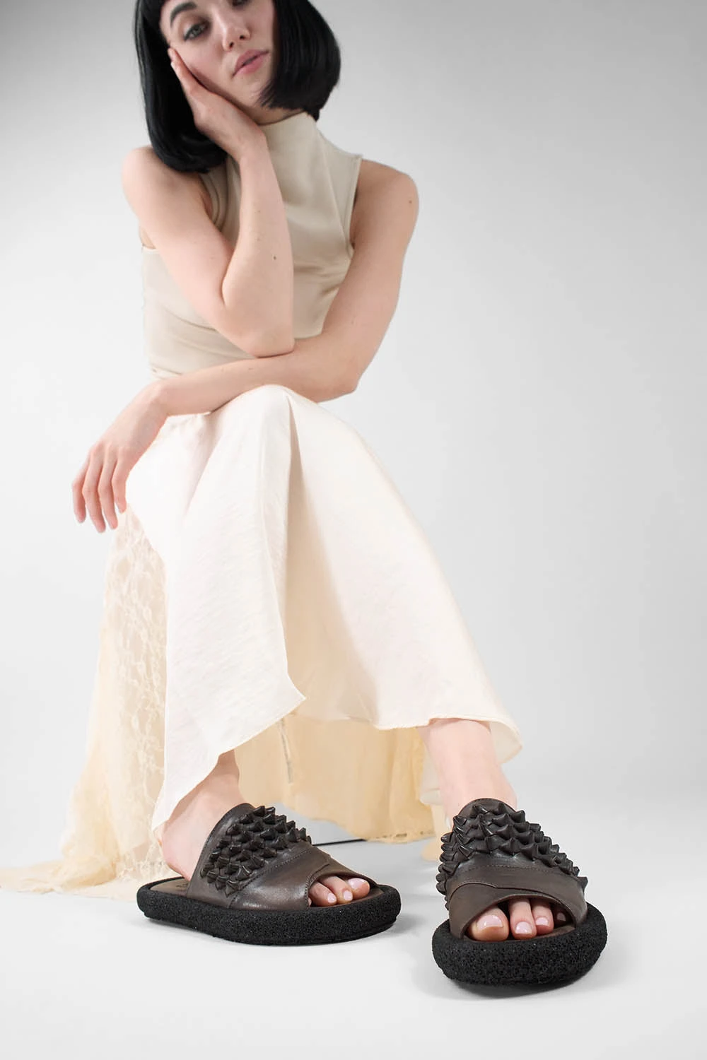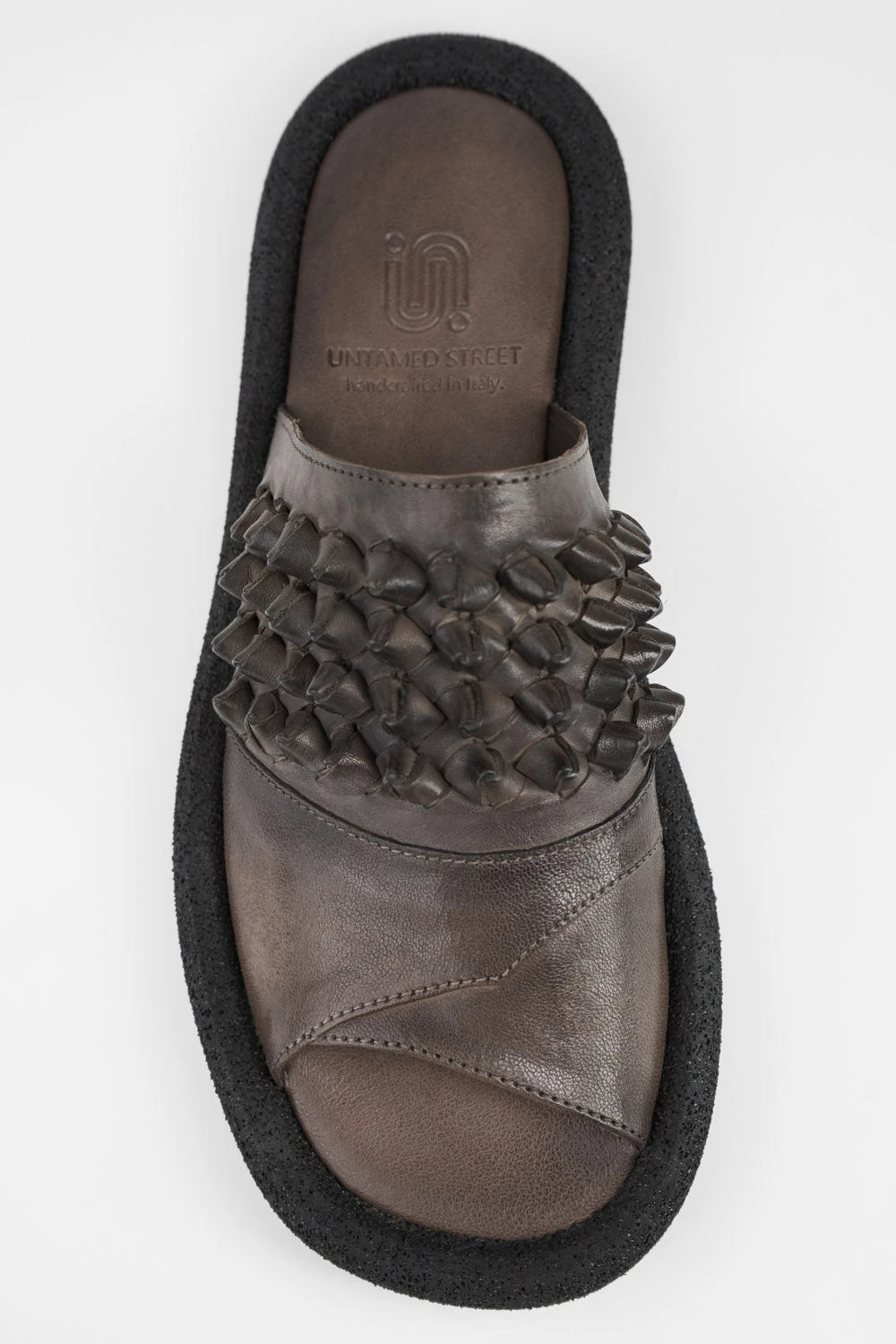 Another exquisite flat leather sandal, featuring an open back and a goatskin upper, lovingly made in Italy, where tradition meets innovation. The wrap-around upper, with an opulent knotted detailing exudes femininity without frills, allowing the natural beauty of the high-quality, incredibly soft goatskin to shine through; the ultralight RUBREX outsole with its built-in cushioned footbed that guarantees all-day wear and comfort with every step.