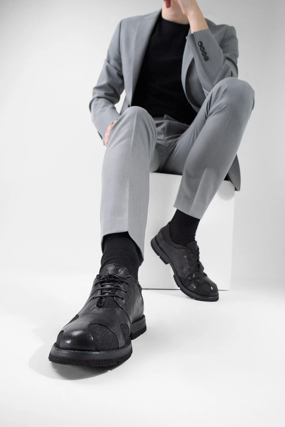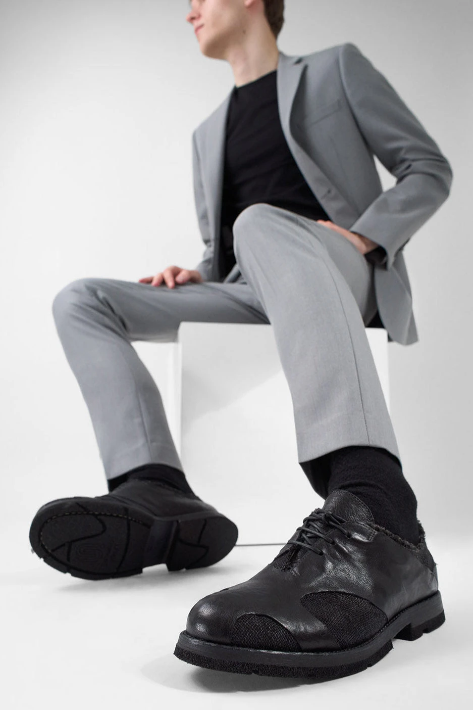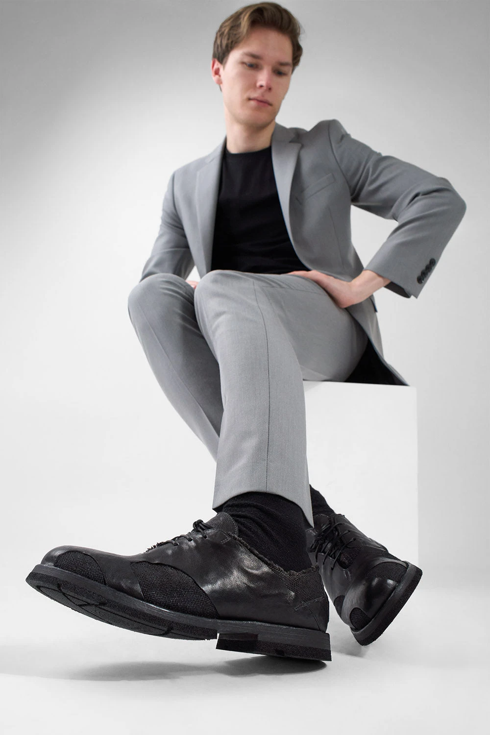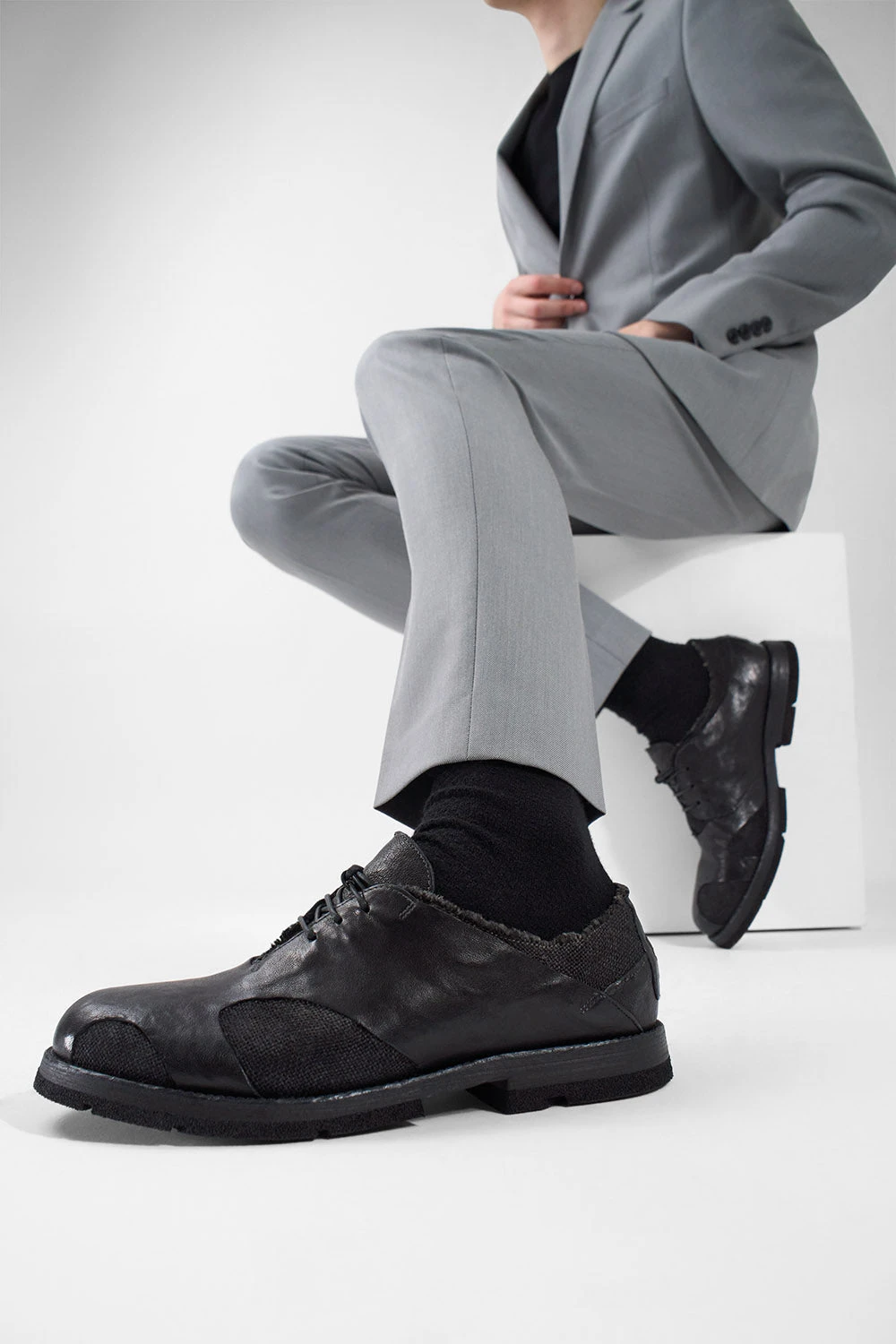 Shoes like no other, these innovative oxford shoes feature a double-layered upper where a canvas ply gleams through the soft, artfully carved goat leather: another masterpiece from our artisans in Montegranaro, where exceptional craftsmanship and refined style intertwine to create perfection. An innovative combination of different materials also applies to the outsole, where a leather layer merges with an ultralight RUBREX lug and heel, delivering exceptional comfort, enhanced flexibility, and reliable grip with every step. Light yet durable, stylish, and elegant. Perfect for elevating any outfit, indulge in the superior comfort and timeless style that only true artisanal creations can provide.