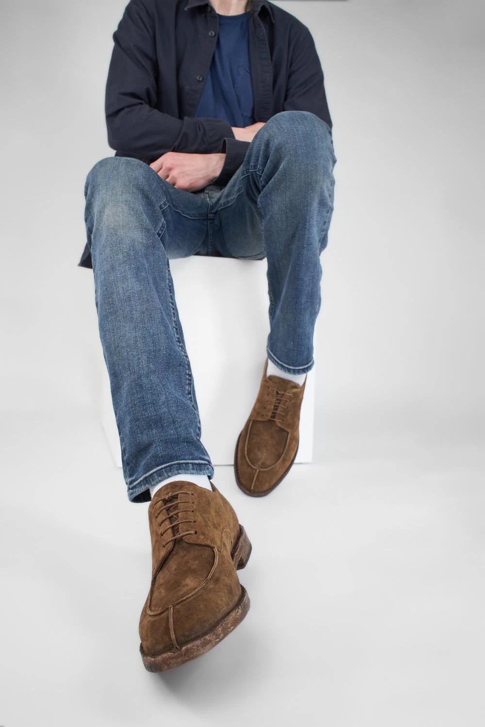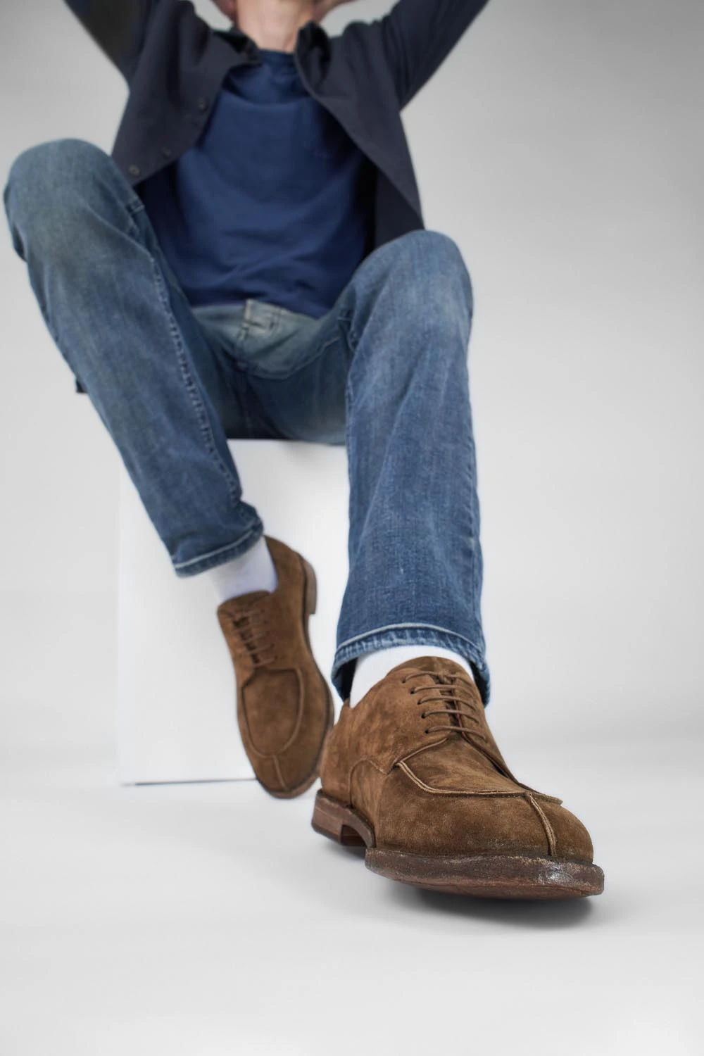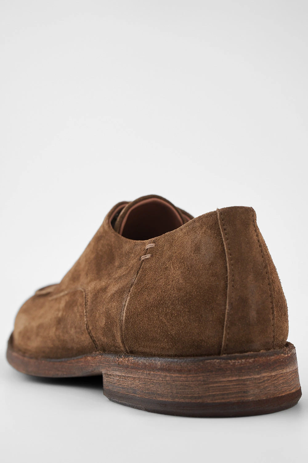 The HAVEN apron derby stands as a masterful reinterpretation of a timeless classic. Handcrafted from luxurious Italian calf suede, this derby undergoes a transformative journey when paired with an irregular single-layer buffalo outsole, distinguished by striking deep wrinkles and a noticeable hand-milling along the profile.