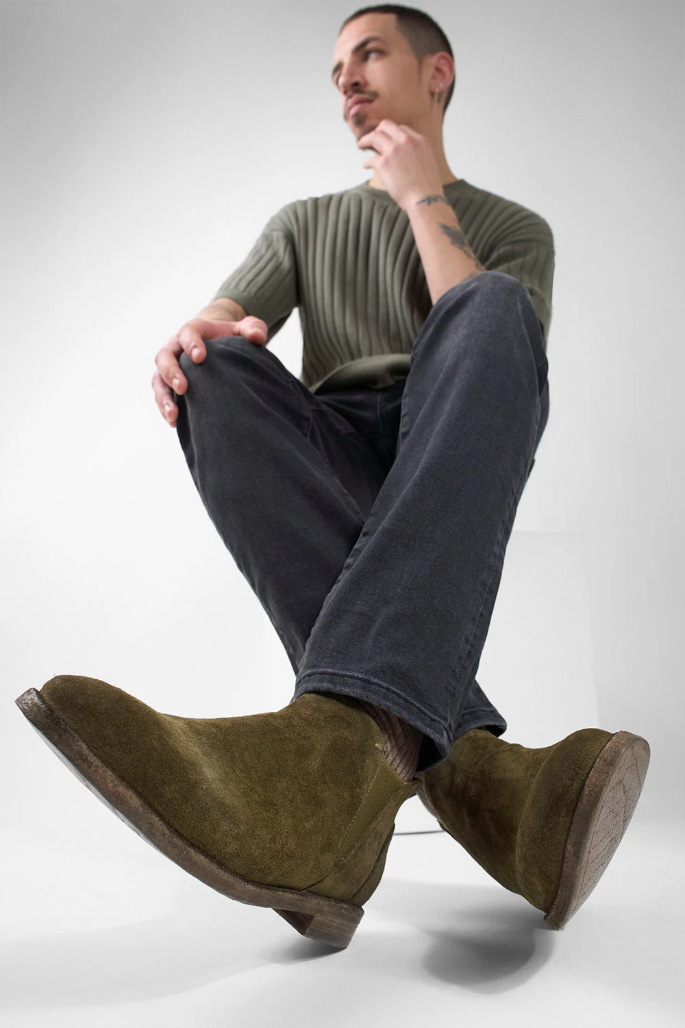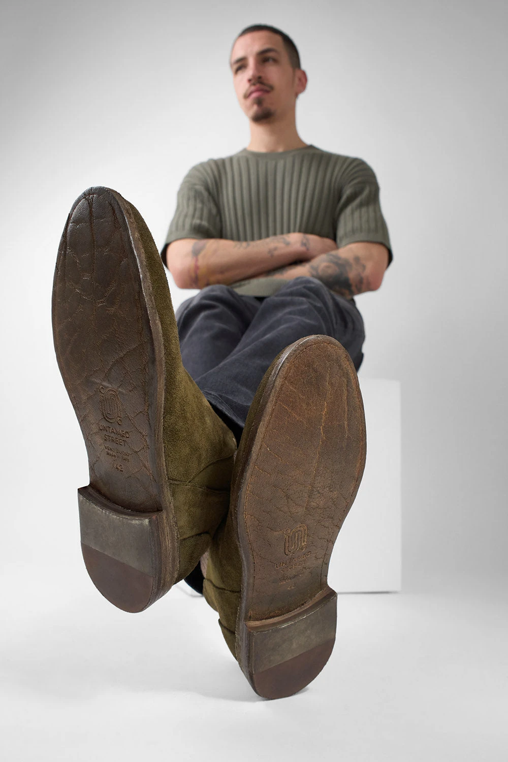 Expertly crafted from the finest calfskin suede in a unique khaki shade, meticulously handpicked for its lush texture and velvety look, the HAVEN Chelsea surprises with an irregular single-layer buffalo outsole with striking deep wrinkles, and intricate hand-milled detailing along the profile.