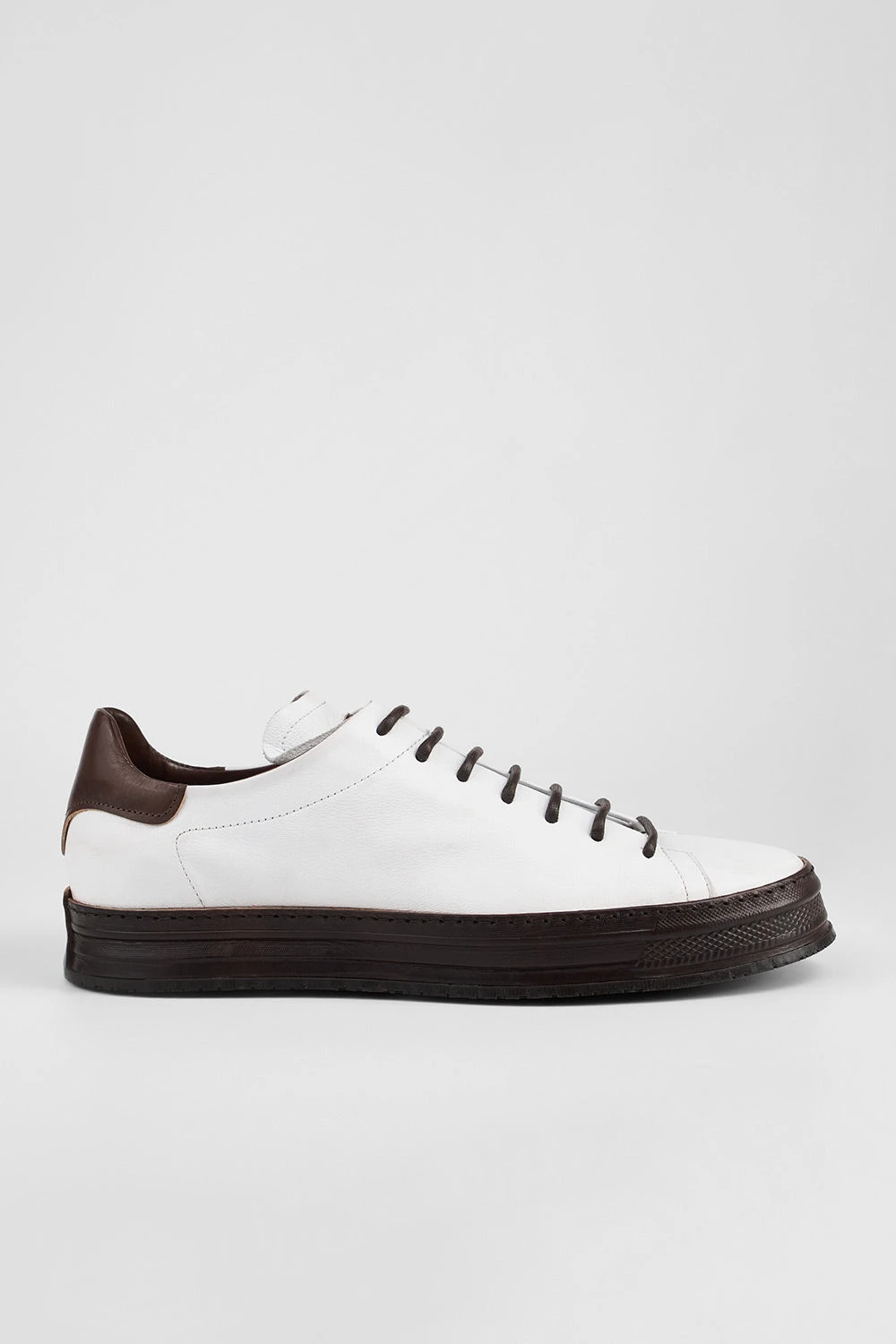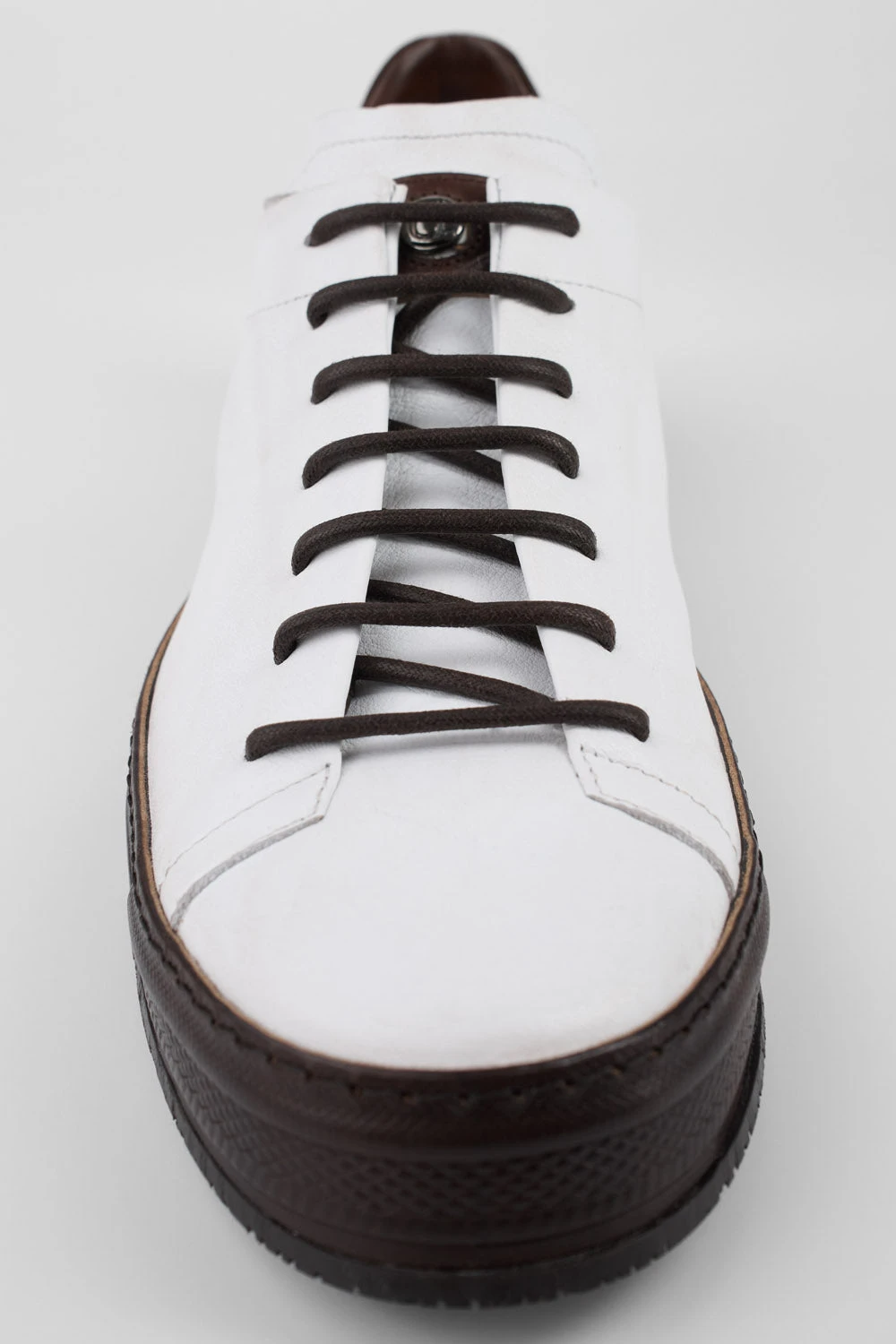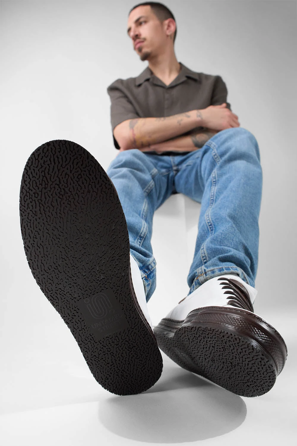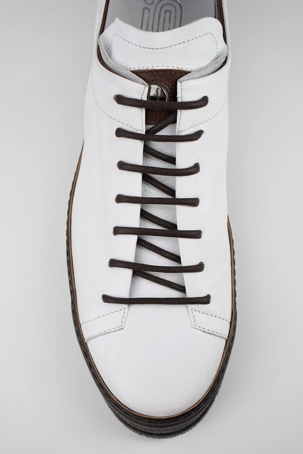 Featuring the perfect blend of elegance, durability, and comfort, our HAYES premium leather sneakers are handcrafted in Italy, in the heart of the Marche footwear district. The luxurious, bright white calf leather beautifully offset the dark brown laces and details with striking contrast. The bold looking upper, with its sharp derby lacing, sits on an elaborate, hand-built cupsole featuring a rubber tread and an eye-catching leather wrap in contrasting colour that covers the entire profile, further adding to the sophistication and uniqueness of these sneakers. A versatile choice for your off-duty or weekend wardrobe, a perfect blend of exceptional quality and versatility that elevates all your less formal attires.