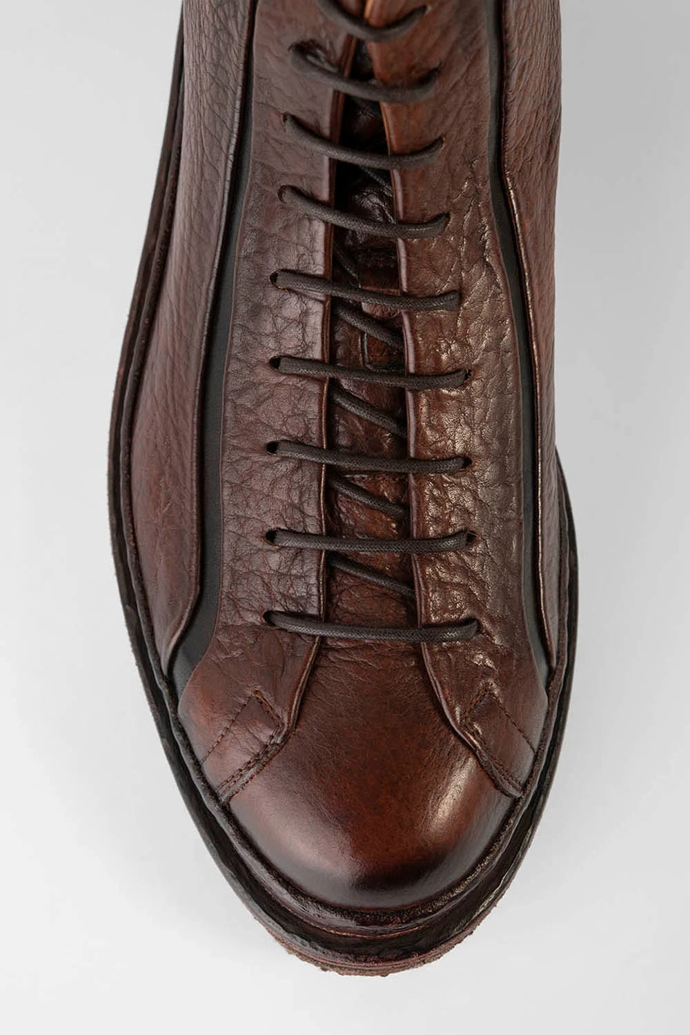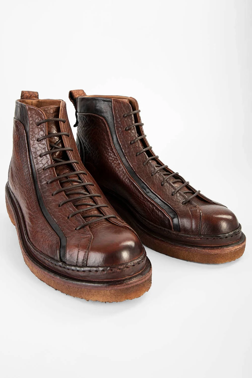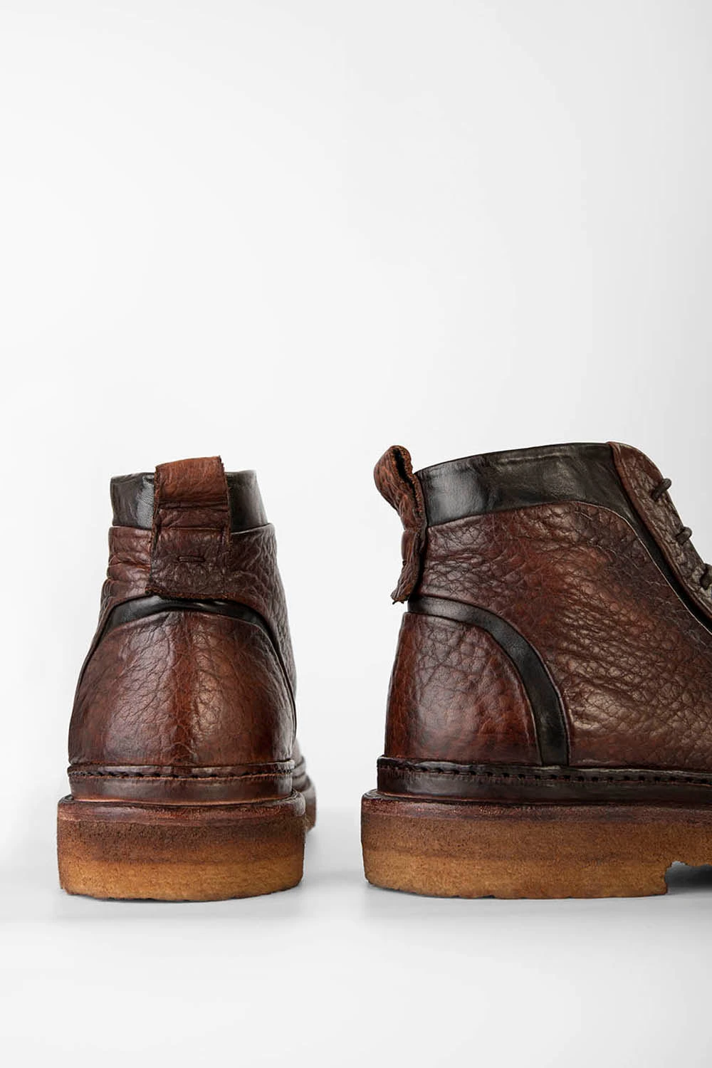 Mind the gap of contrasting black calf leather against the luxurious folds of the grained bison leather upper dyed in intense cognac-brown shades. Designed based on the rail lines, these crevices flow exquisitely across the excitingly textured pebbled-grain bison upper. A powerful and flexible natural crepe outsole lightly antiqued and masterfully attached to a double thick welt, the signature of the HOVE collection, completes this stunning ankle boot. A truly beautiful and unconventional ankle boot for those who appreciate art in the sole of your feet.