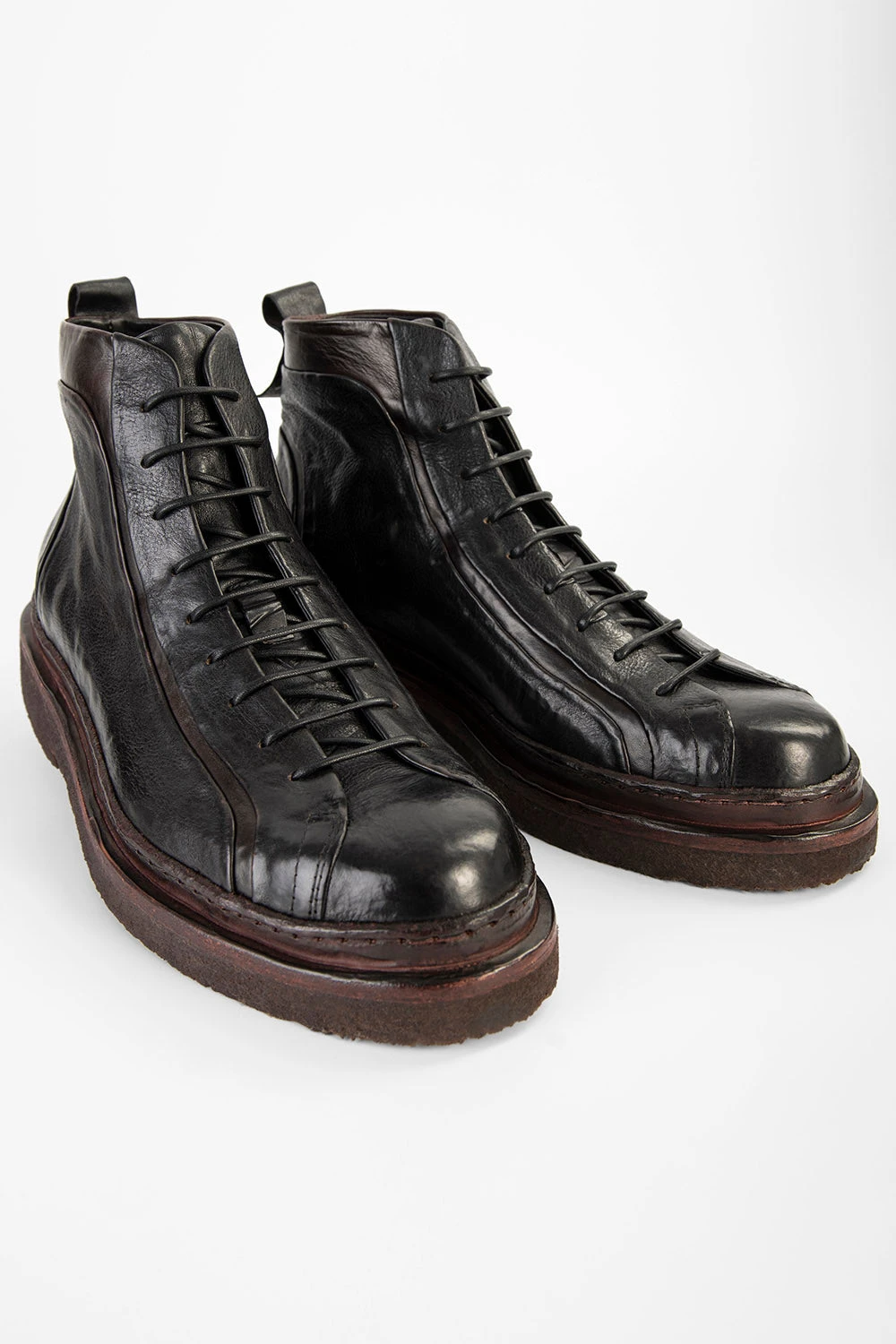 Mind the gap of contrasting dark brown grooves against the luxurious folds of the pitch-black full-grain leather upper. Designed based on the rail lines, these crevices flow exquisitely across the excitingly textured upper. A powerful and flexible natural crepe outsole lightly antiqued and masterfully attached to a double thick welt, the signature of the HOVE collection, completes this stunning ankle boot. A truly beautiful and unconventional ankle boot for those who appreciate art in the sole of your feet.