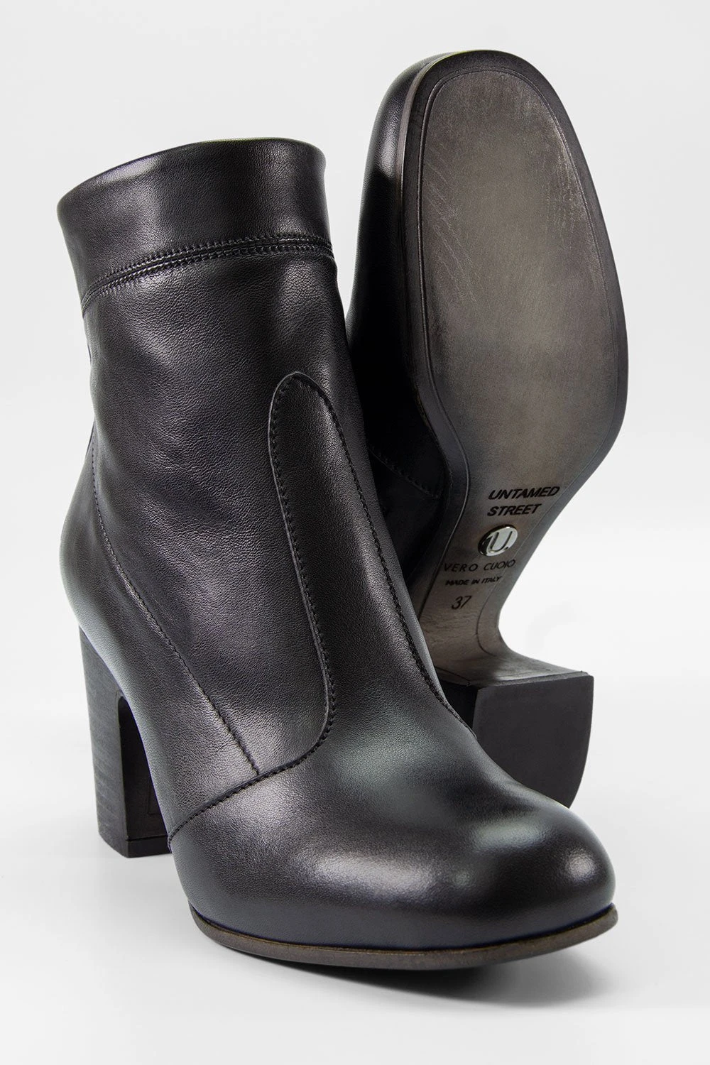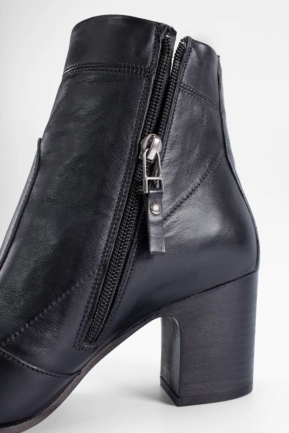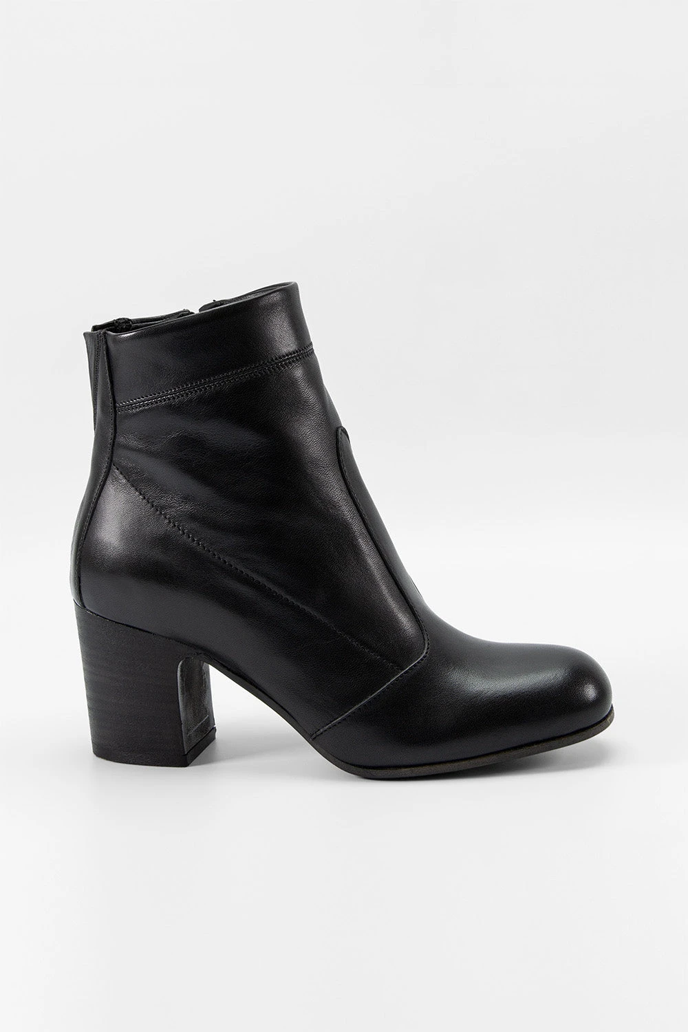 Sexy and soft, with its curvy and elegant silhouette and the staple arched heel of the MOORE collection, this bootie is rendered in butter-soft, full-grain nappa leather, inside and out. Designed with an invisible elasticated back which allows for a comfortable and hugging fit around the ankle, a side zipper with a leather puller for ease to put it on and off, and an ideal mid-heel height, this style is perfect for all-day, all-year wear.