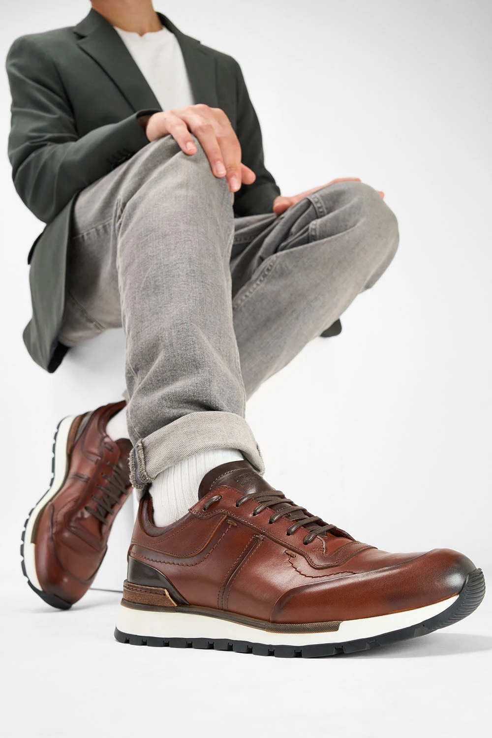 A masterpiece of elegance and craftsmanship, this dressy runner is hand-crafted in Italy from the finest calf leather, dyed to perfection. The exquisite patina effects that adorn the sides are emphasized by the intricate triple stitching, resulting in a stunning interplay of colours and shades; the eye-catching leather inserts adorning the back and the tongue, add to the creativity and originality of the design. A remarkable piece exuding an aura of sophistication and beauty that is a testament to the dedication and skill of the artisans who created it.