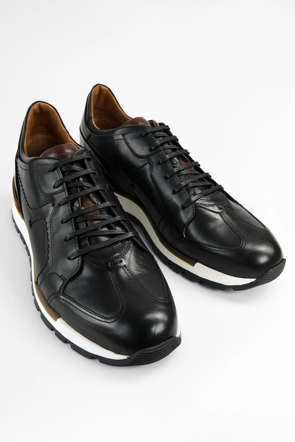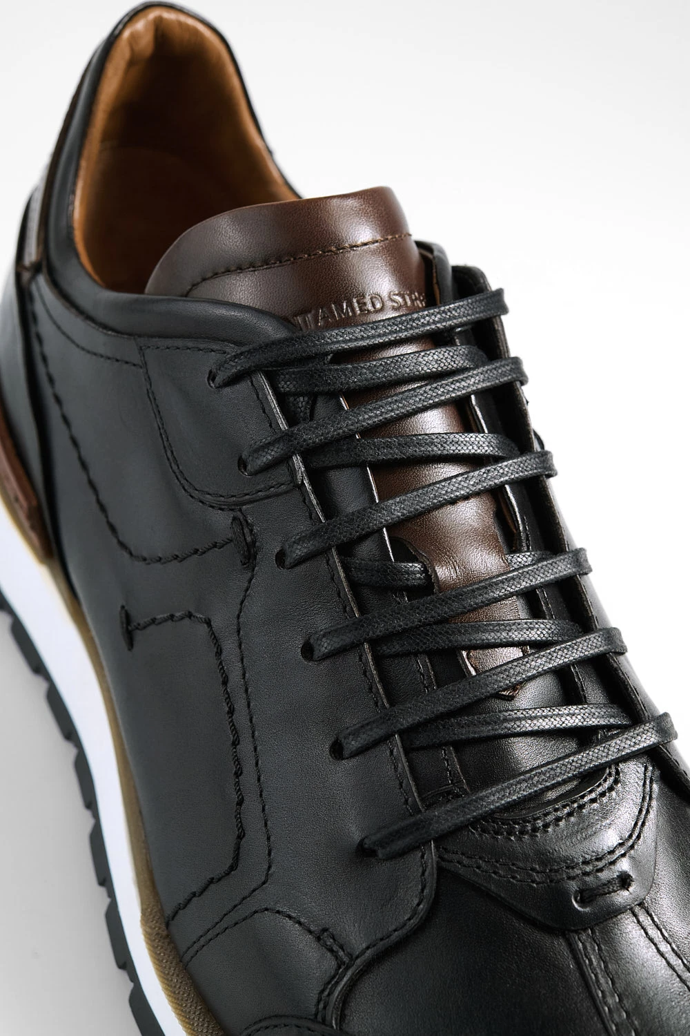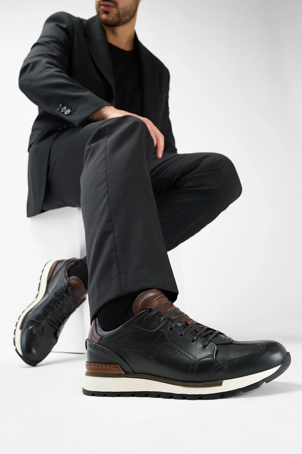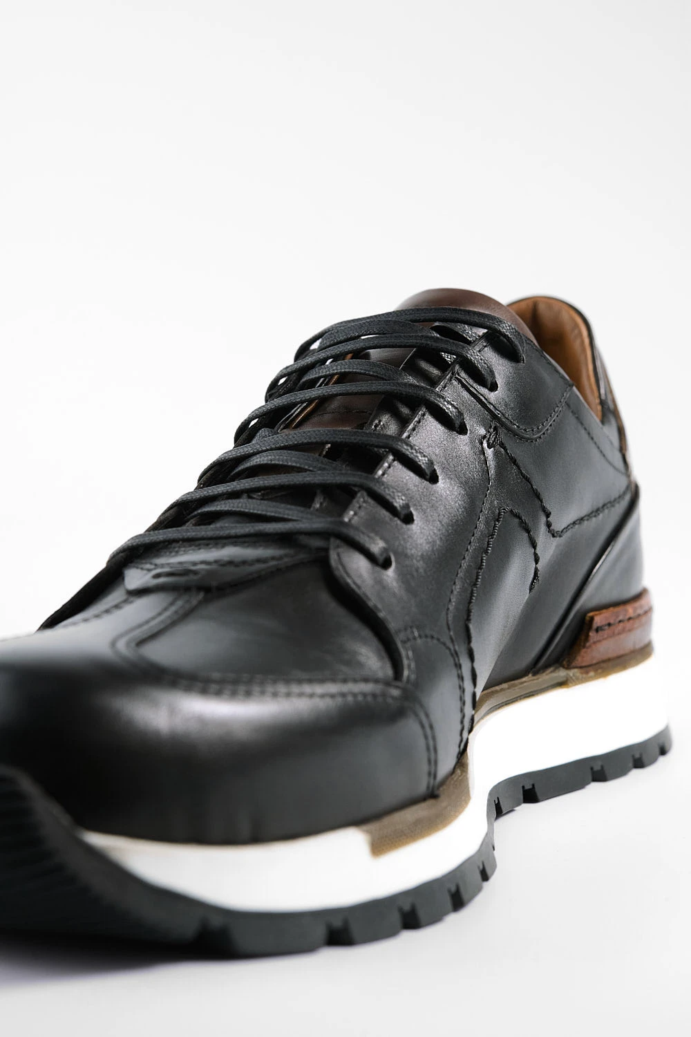 A majestic addition to our runners collection, an exquisite piece, meticulously crafted from top-quality calf leather, showcasing the epitome of Italian craftsmanship and timeless elegance. Featuring the best calf leather, styled in a refined wingtip, this runner stands on its own, with its rich black hue, the precision of the elaborate stitching, the eye-catching leather inserts adorning the back. A testament to our artisans’ dedication to creating a product of the highest calibre. A dressy runner that exudes an aura of sophistication and beauty that will undoubtedly become a treasured addition to your footwear collection.