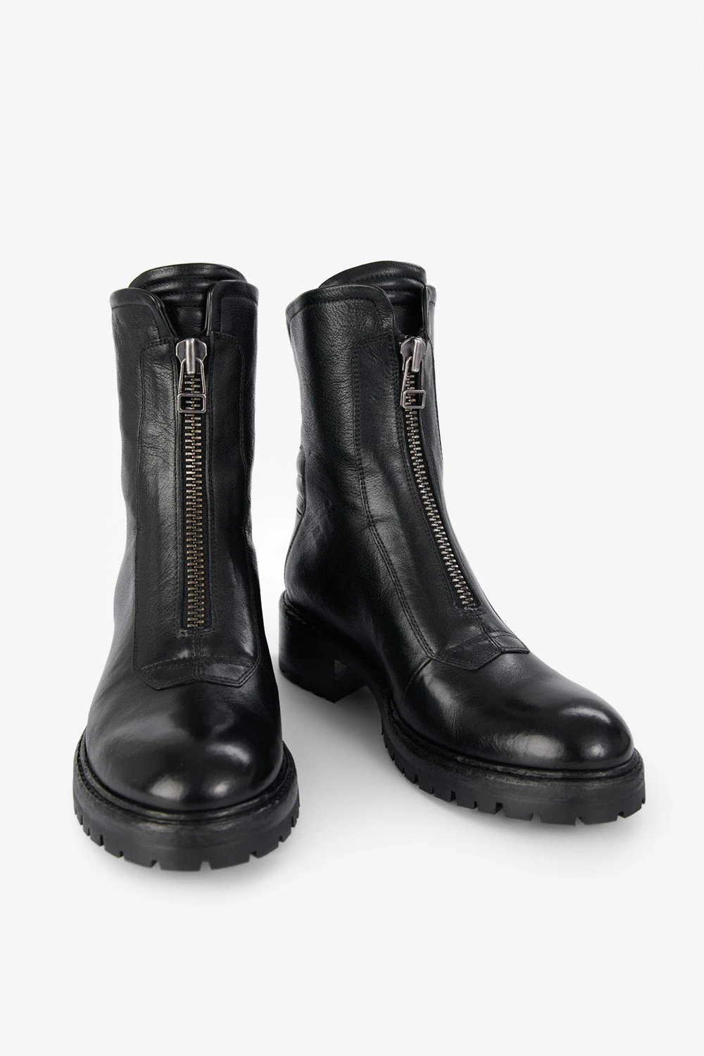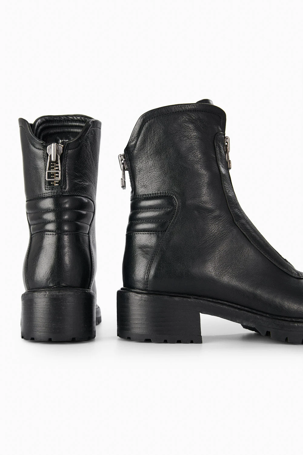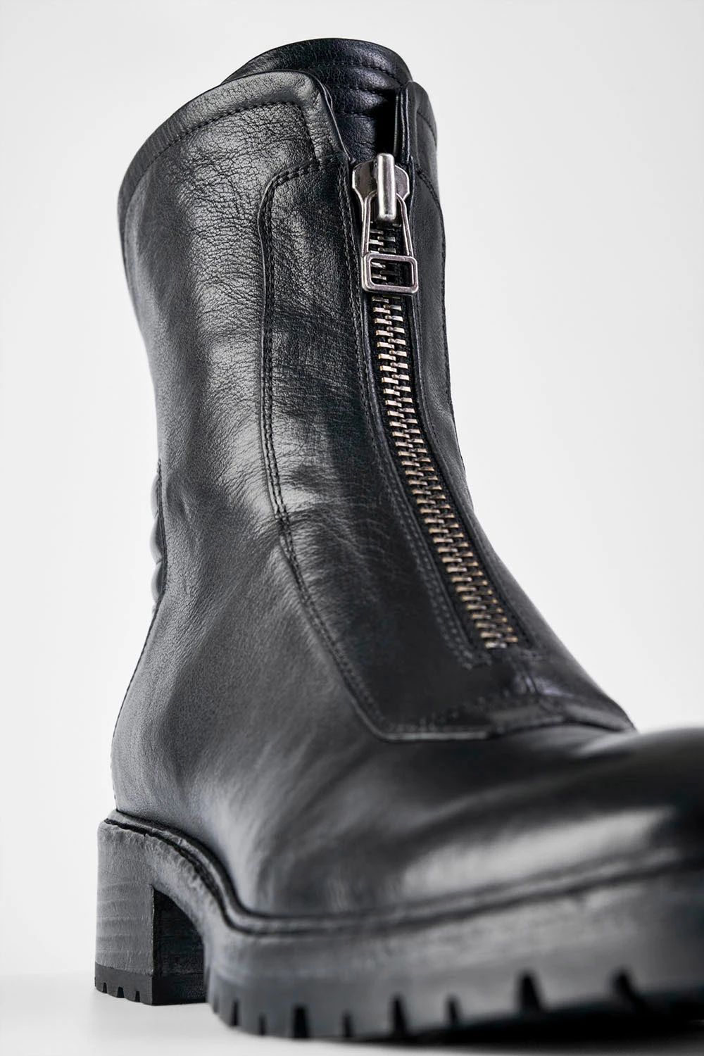 Functional, hard-wearing and chic, these front-zipped boots have a utilitarian design and attention-grabbing aesthetics. The beautiful curves and impressive profile of the upper sit on a low block heel, for endless comfort, and the leather sole is equipped with rugged lug pads for grip and durability. The functional front and back zippers truly shine on these boots, that break away from the traditional restrictions of other biker boots to stand on their own. And they look fantastic when paired with leggings, jeans, and short and long skirts.