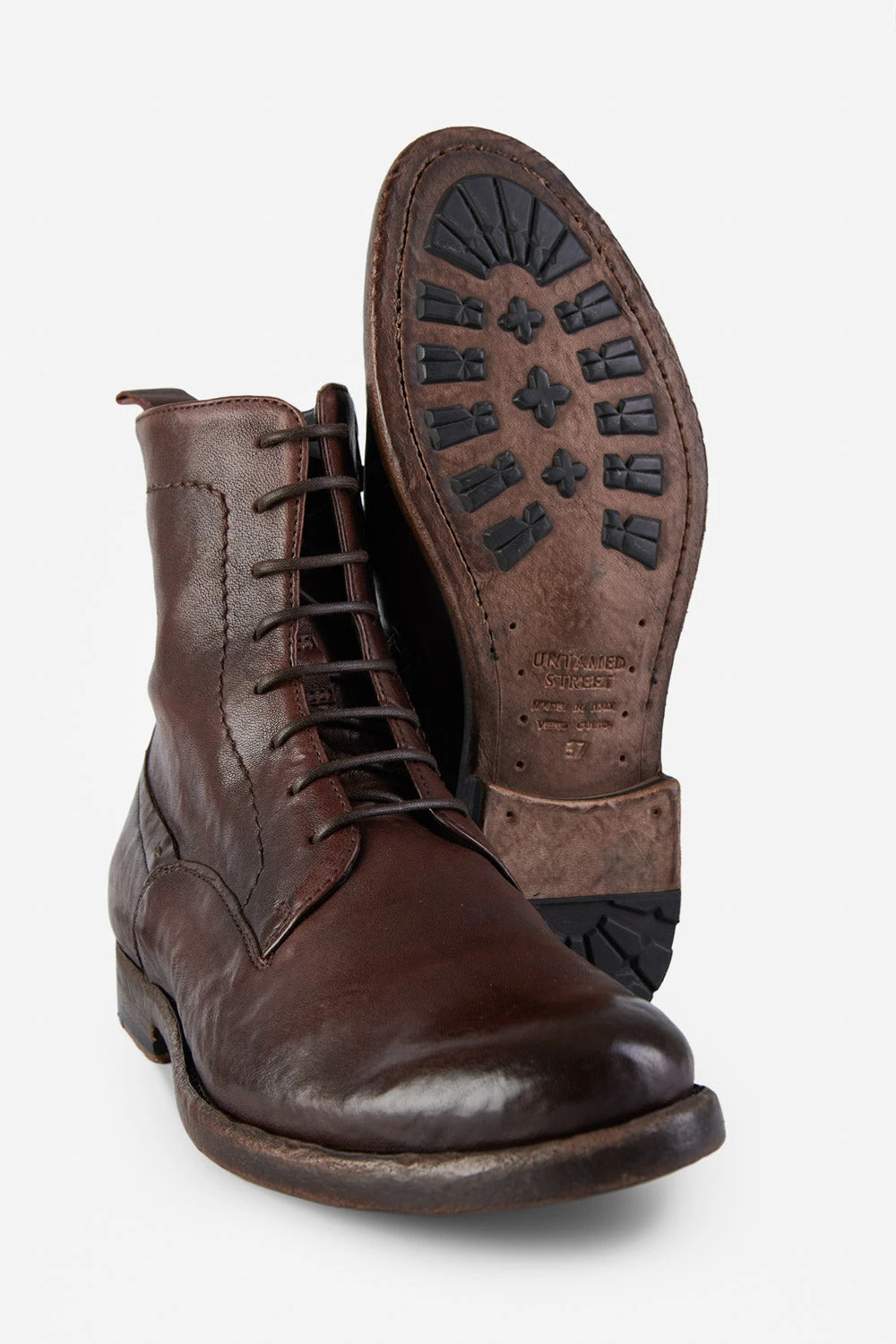 These exquisite handmade ankle boots are the contemporary incarnation of artisanal craftsmanship. The finest full-grain buffalo leather is hand-dyed a beautiful shade of chocolate brown, stonewashed and polished by hand, and Blake-stitched onto a hand-built buffalo leather sole. A firm everyday favourite, these leather commando boots are perfect for long city days -rain, hail or shine-.