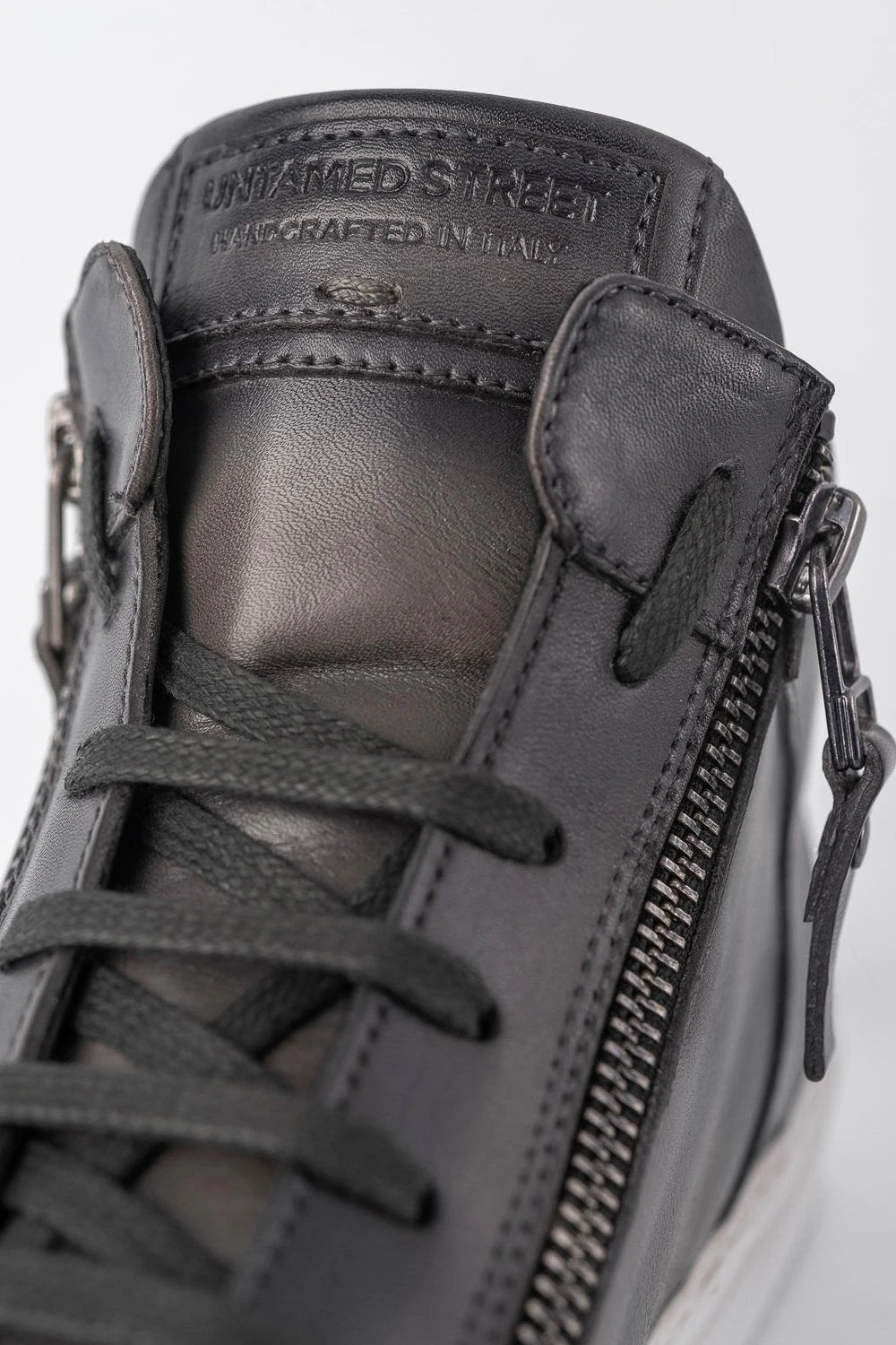 Entirely crafted in Italy from luxurious vegetable-tanned calf leather, this luxurious sneaker features patina shades of grey and a wide-indented tread pattern outsole from Margom. A lace-up style finishes this sleek silhouette with a side double-zip detailing and an eye-catching tonal tab with an embossed logo. With its clean lines and minimalist style, this elevated sneaker pairs beautifully with just about everything. Unconventional elegance for the man seeking something unique.
