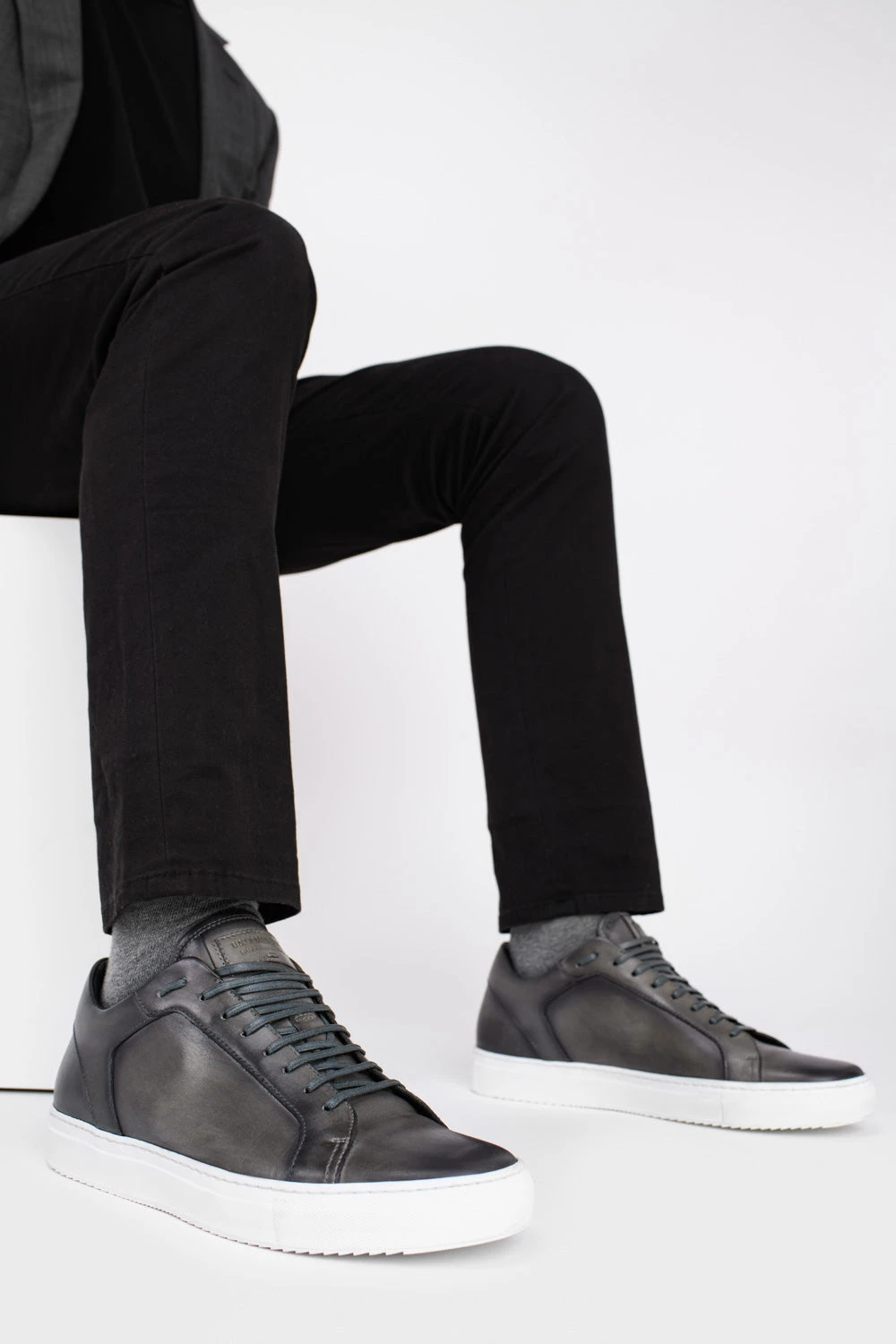 A luxurious sneaker featuring patina shades of grey and a wide-indented tread pattern outsole from Margom. A lace-up style finishes this sleek silhouette alongside an eye catching tonal tab with embossed logo. With its clean lines and minimalist style, this is an elevated sneaker which can be paired with both formal and casual pieces.