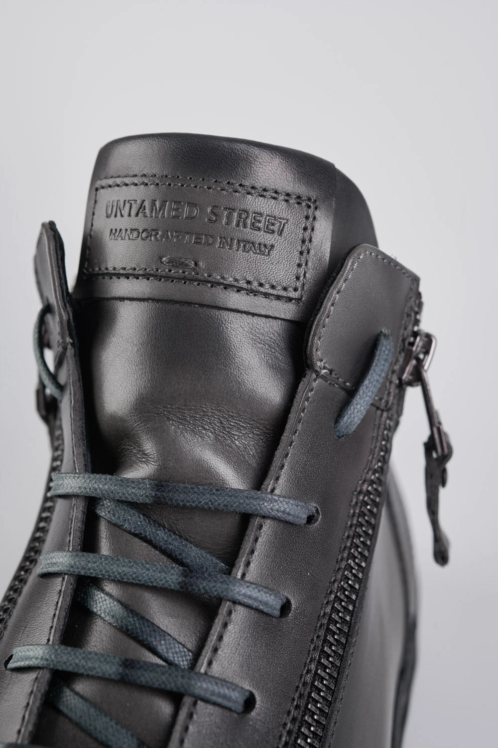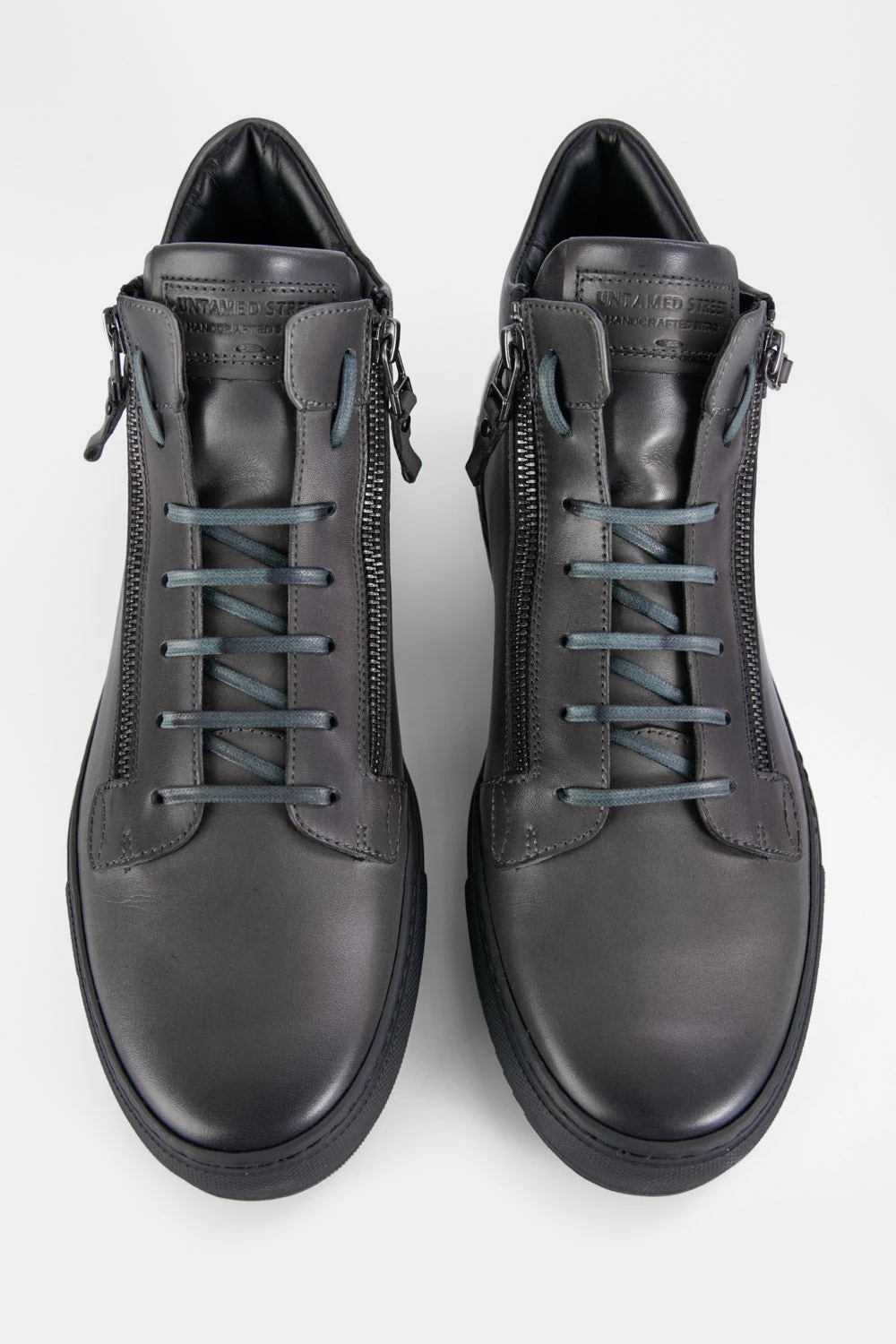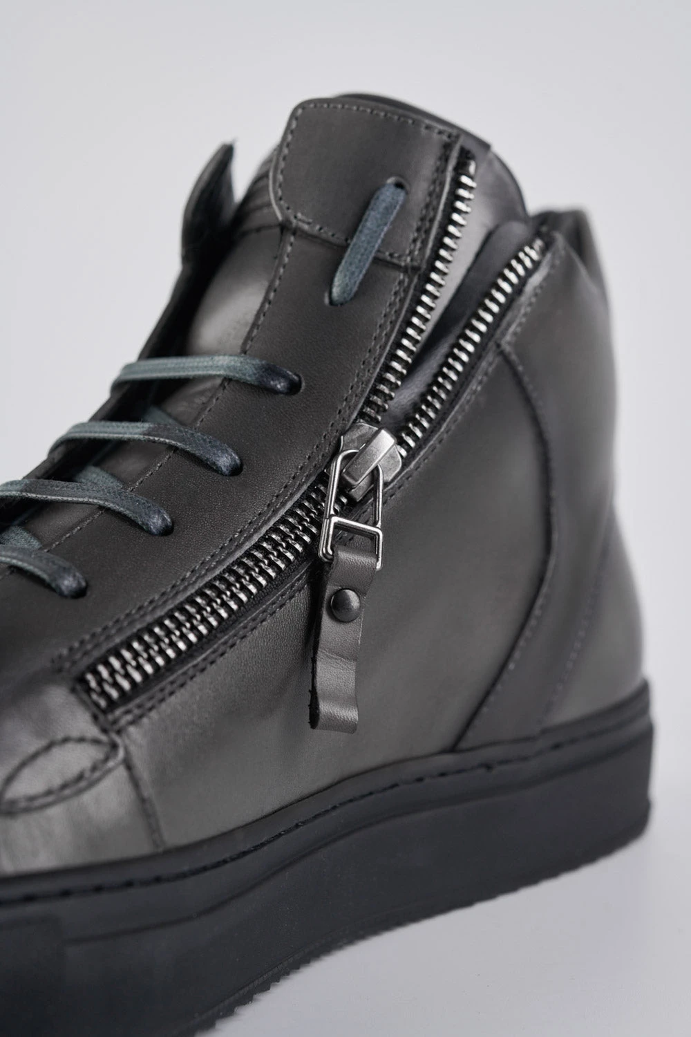 Entirely crafted in Italy from luxurious vegetable-tanned calf leather, this is a luxurious sneaker featuring patina shades of grey and a black wide-indented tread pattern outsole from Margom. A lace-up style finishes this sleek silhouette, along with a side double-zip detailing and an eye-catching tonal tab with an embossed logo. With its clean lines and minimalist style, this elevated sneaker pairs beautifully with just about everything. Unconventional elegance for the man seeking something unique.