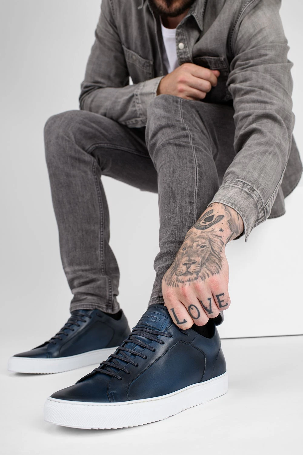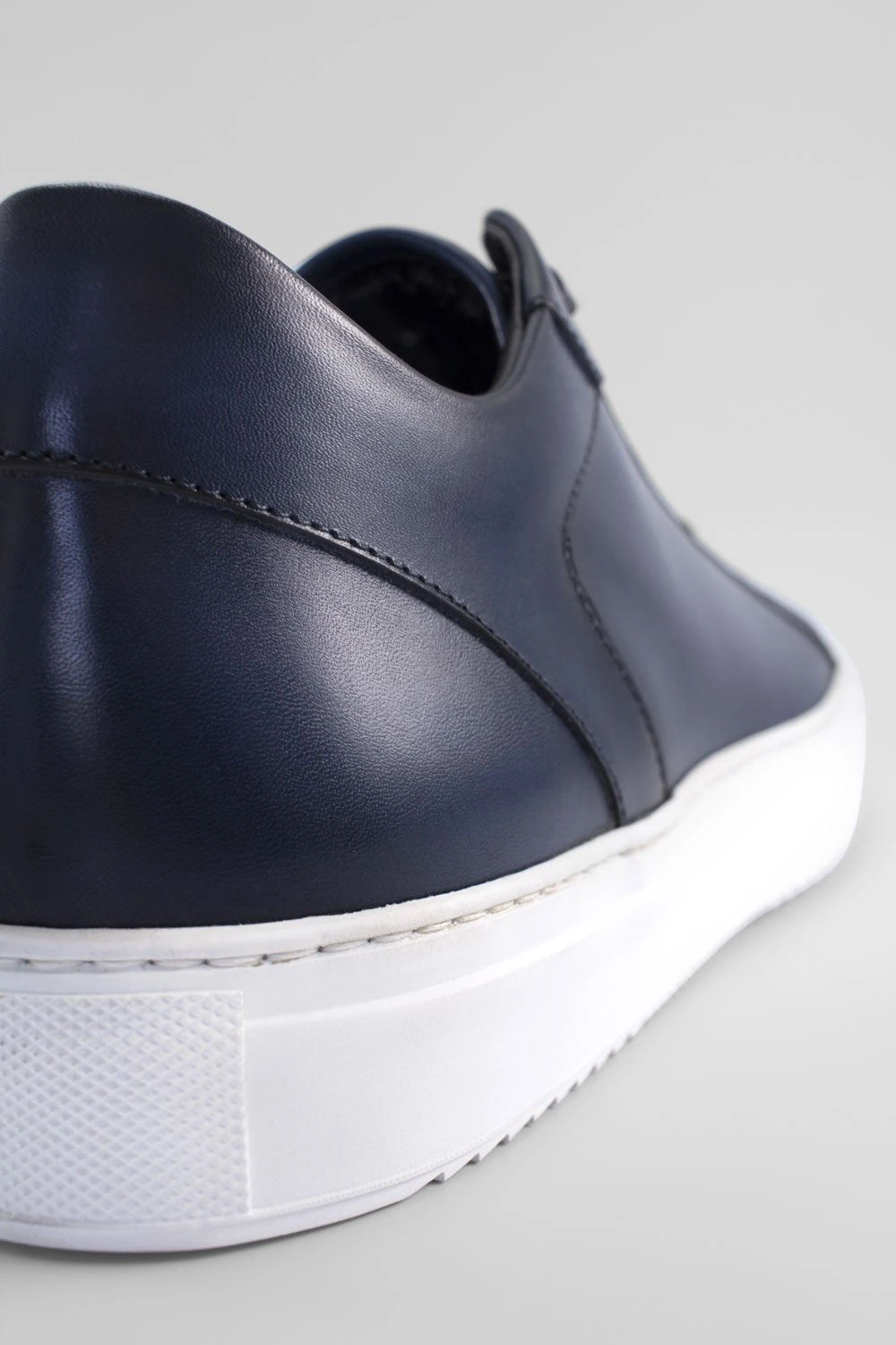 A luxurious sneaker featuring patina shades of meteorite blue and a wide-indented tread pattern outsole from Margom. A lace-up style finishes this sleek silhouette alongside an eye catching tonal tab with an embossed logo. With its clean lines and minimalist style, this is an elevated sneaker which can be paired with both formal and casual pieces.