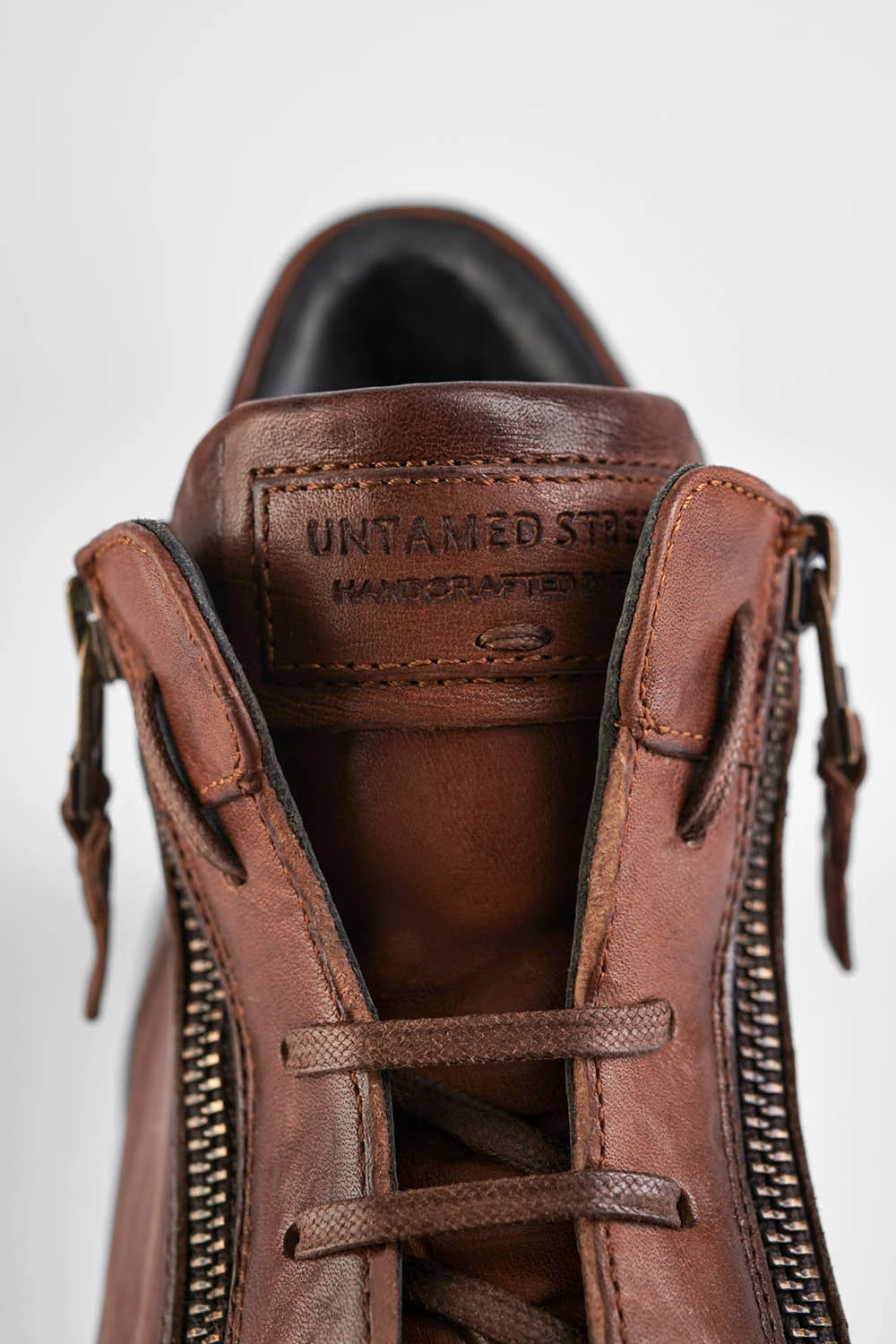 Entirely hand-crafted in Italy from luxurious vegetable-tanned calf leather, uniquely hand-dyed, stonewashed and distressed. This is a magnificent sneaker, featuring patina shades of warm brown, beautifully emphasised by the stone washing, and a wide-indented tread pattern outsole from Margom. A lace-up style finishes this sleek silhouette with a side double-zip detailing and an eye-catching tonal tab with an embossed logo. With its clean lines and bold style, this high-top is the quintessence of unconventional elegance, for the man who always stands out.