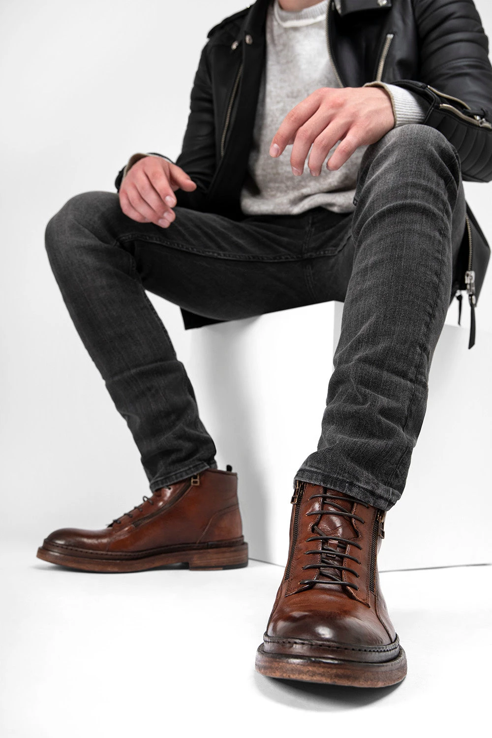 A beautifully crafted chukka boot, elevated by two frontal zippers and featuring the sophisticated welted buffalo leather sole hallmark of our YORK collection. This style is skillfully handmade in Italy from vegetal-tanned calf leather, hand-dyed in a warm shade of brown, stonewashed and brushed to enhance its bold personality and rebellious edge. Impeccable quality, the finest Italian craftsmanship and a design that is urban chic in its essence.