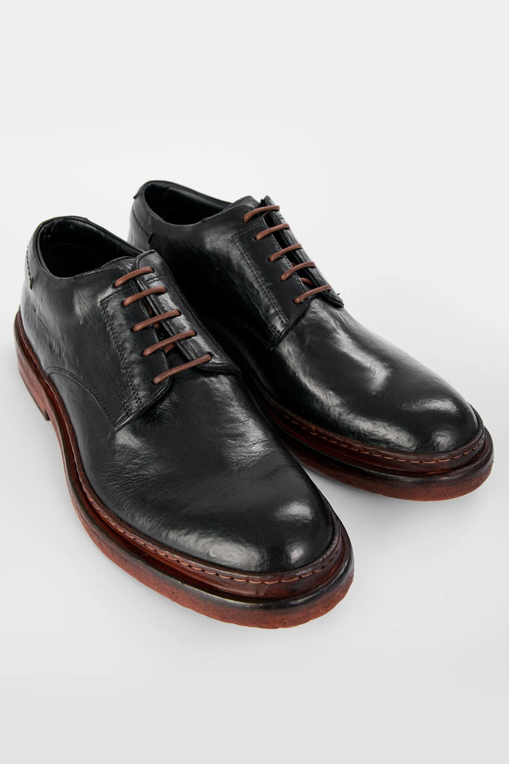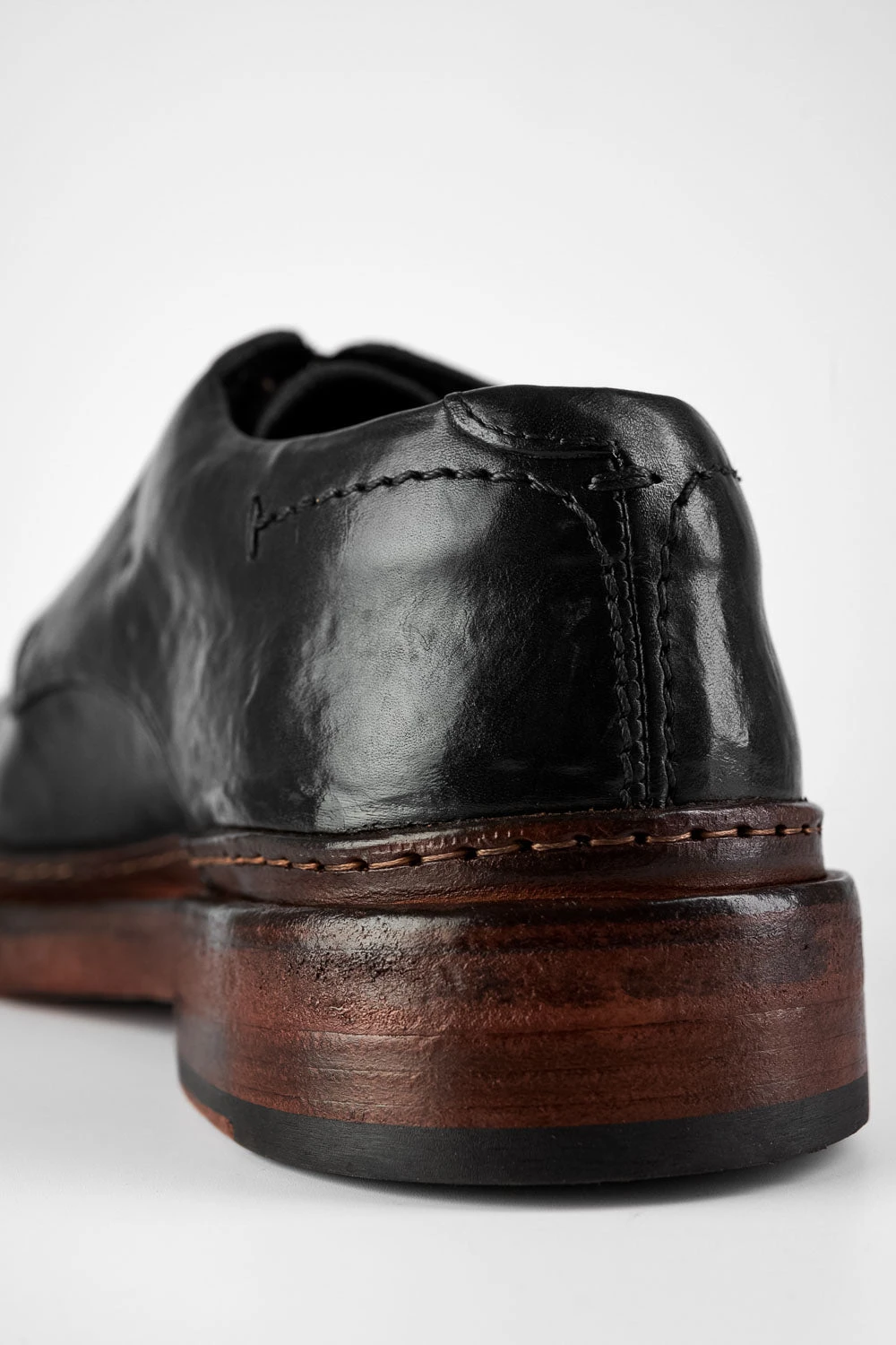 A classic style, elevated by an unconventional design and a sophisticated buffalo leather sole with an eye-catching oversized welt. This beautiful derby shoe is skillfully handmade in Italy from vegetal-tanned buffalo leather, hand-dyed, stonewashed, waxed and brushed to enhance its bold personality and rebellious edge. Urban chic in its essence, this derby celebrates the man who understands craftsmanship and relaxed refinement.