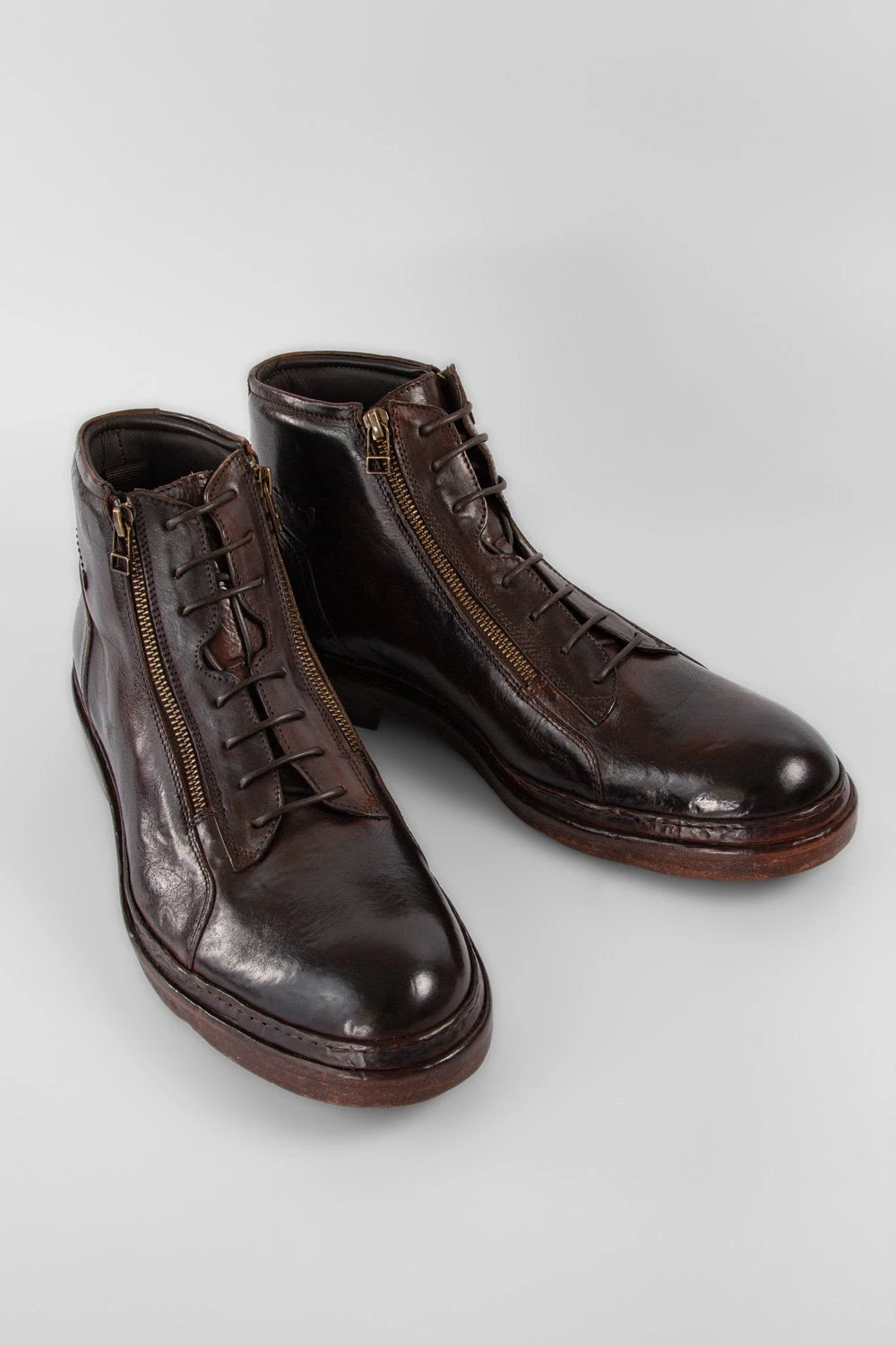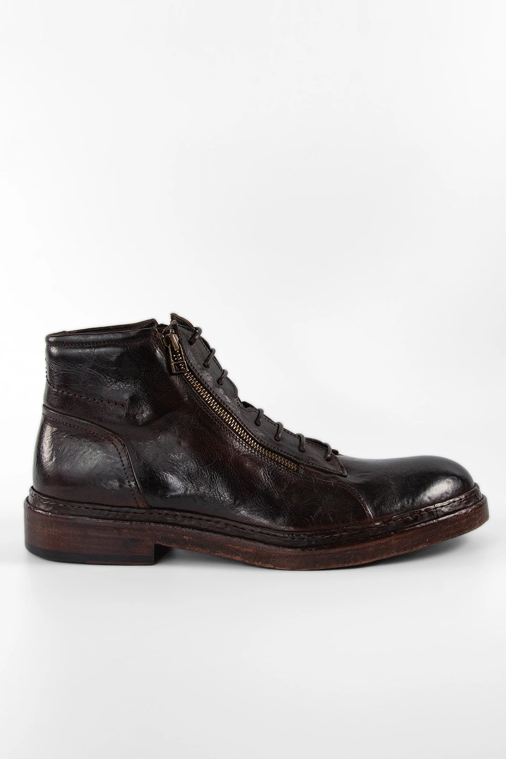A beautifully crafted chukka boot, elevated by two frontal zippers and featuring the sophisticated welted buffalo leather sole hallmark of our YORK collection. This style is skillfully handmade in Italy from vegetal-tanned buffalo leather, hand-dyed in a dark shade of brown, stonewashed and brushed to enhance its bold personality and rebellious edge. Impeccable quality, the finest Italian craftsmanship and a design that is urban chic in its essence.